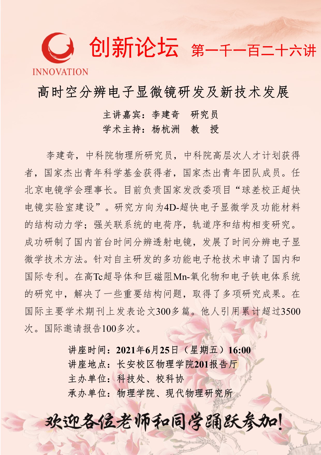 李建奇 研究员 广发体育创新论坛第一千一百二十六讲:高时空分辨电子显微镜研发及新技术发展 讲座时间 2021年6月25日(星期五)16:00 讲座地点 长安校区物理学院201报告厅 讲座人介绍 李建奇 研究员 讲座内容