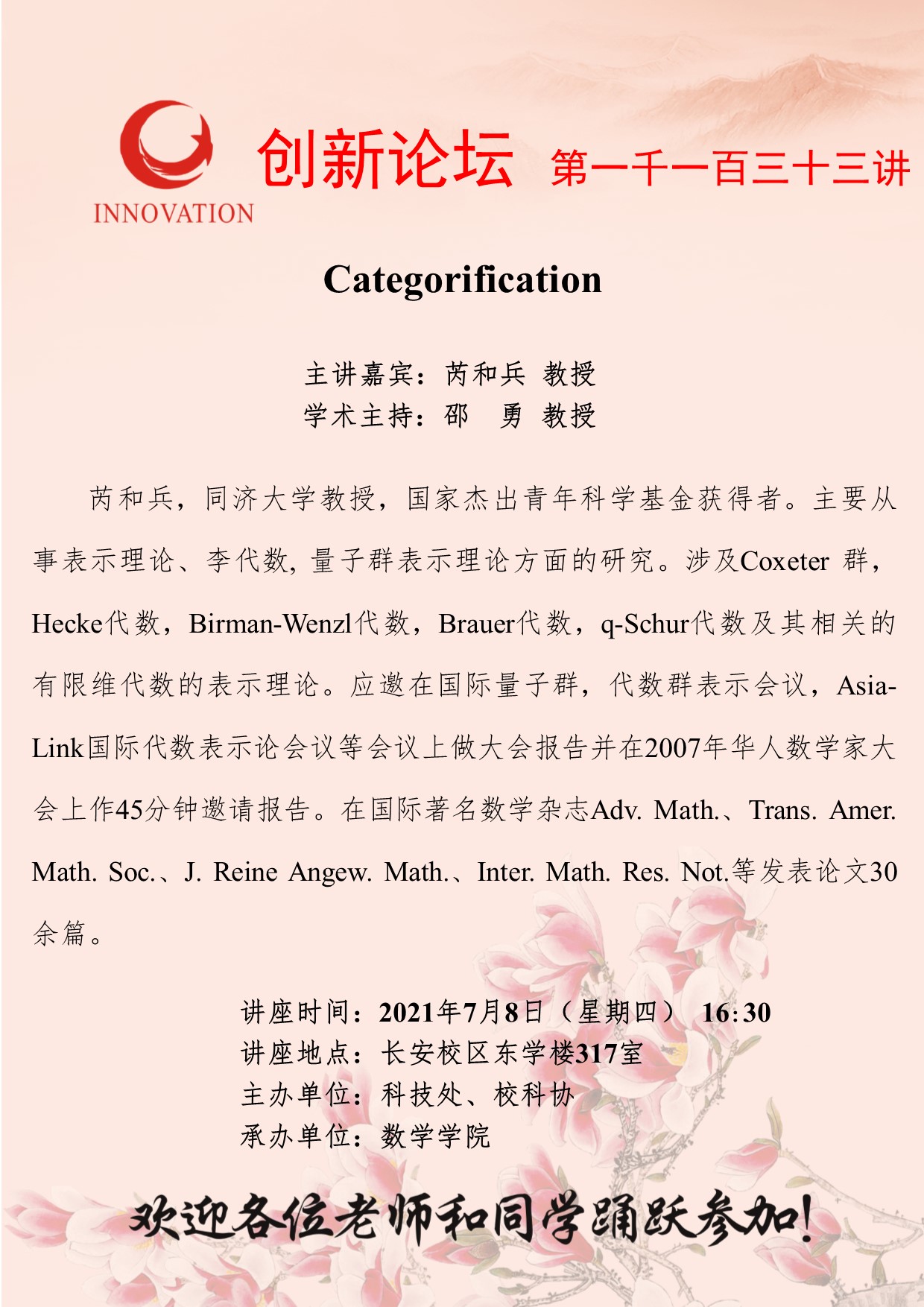 芮和兵 教授 广发体育创新论坛第一千一百三十三讲:Categorification 讲座时间 2021年7月8日(星期四)16:30 讲座地点 长安校区东学楼317室 讲座人介绍 芮和兵 教授 讲座内容