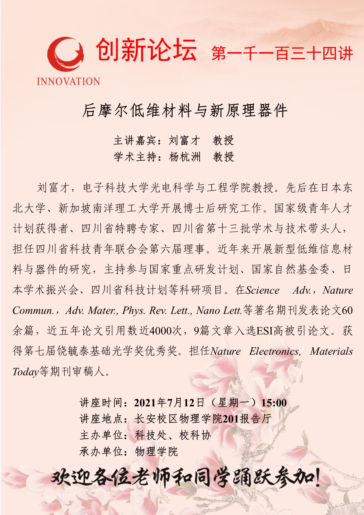 刘富才 教授 广发体育创新论坛第一千一百三十四讲:后摩尔低维材料与新原理器件 讲座时间 2021年7月12日(星期一)15:00 讲座地点 长安校区物理学院201报告厅 讲座人介绍 刘富才 教授 讲座内容