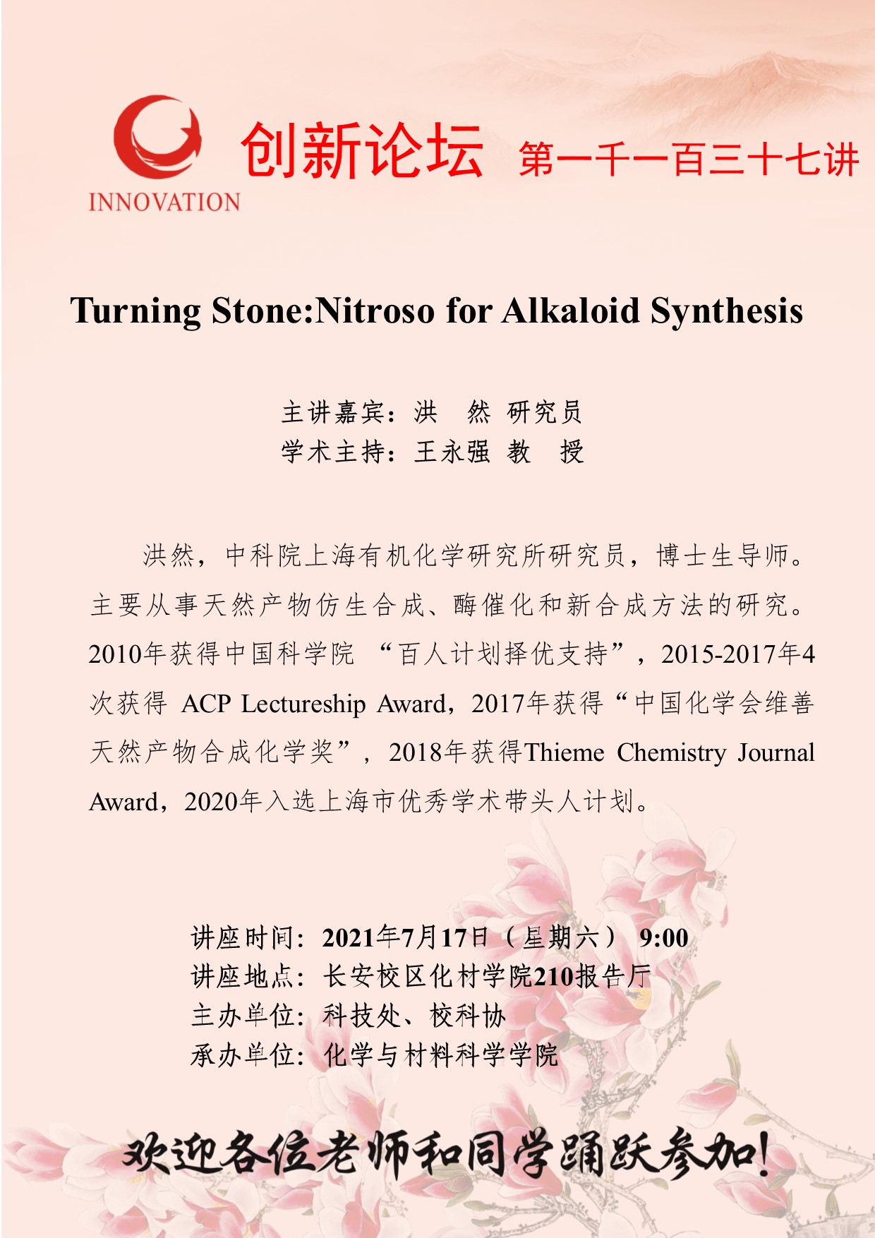 洪然 研究员 广发体育创新论坛第一千一百三十七讲:Turning Stone:Nitroso for Alkaloid Synthesis 讲座时间 2021年7月17日(星期六) 9:00 讲座地点 长安校区化材学院210报告厅 讲座人介绍 洪然 研究员 讲座内容