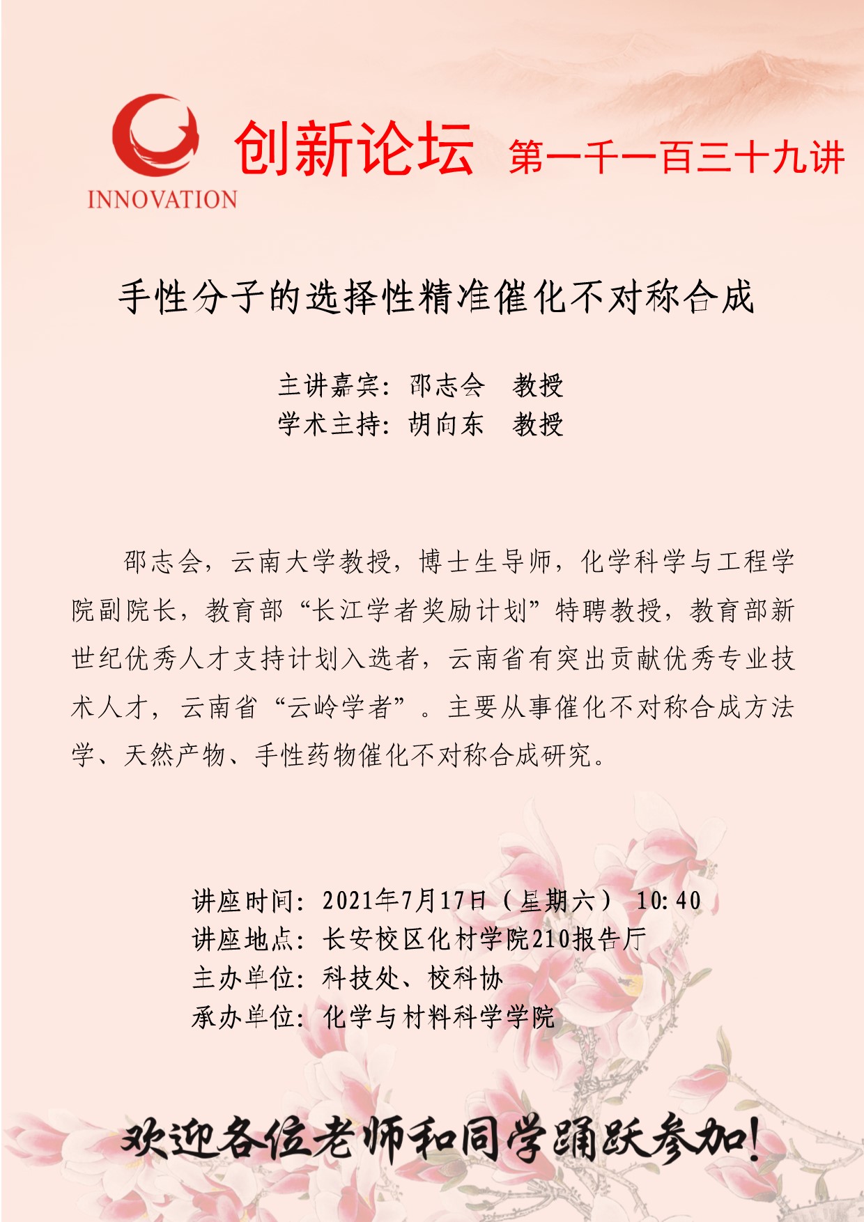 邵志会 教授 广发体育创新论坛第一千一百三十九讲:手性分子的选择性精准催化不对称合成 讲座时间 2021年7月17日(星期六) 10:40 讲座地点 长安校区化材学院210报告厅 讲座人介绍 邵志会 教授 讲座内容
