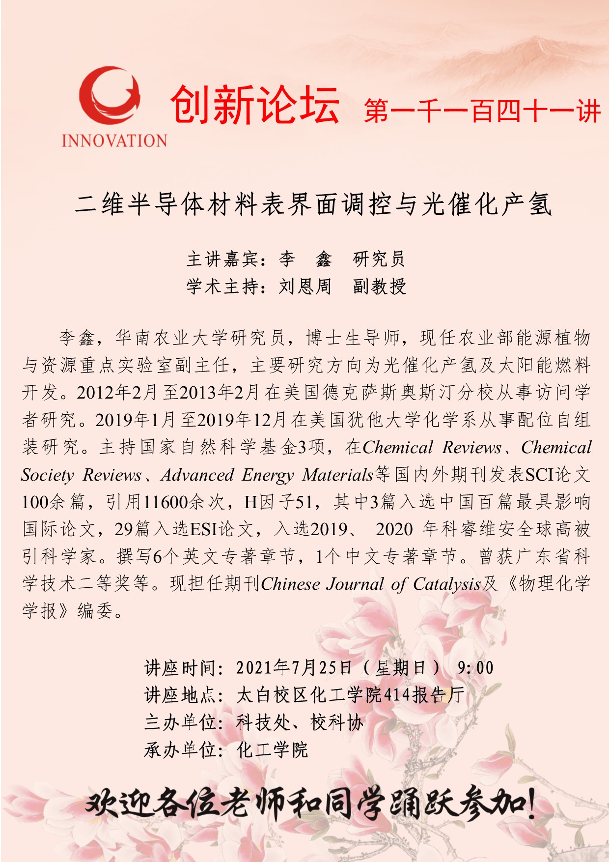 李鑫 研究员 广发体育创新论坛第一千一百四十一讲:二维半导体材料表界面调控与光催化产氢 讲座时间 2021年7月25日(星期日) 9:00 讲座地点 太白校区化工学院414报告厅 讲座人介绍 李鑫 研究员 讲座内容