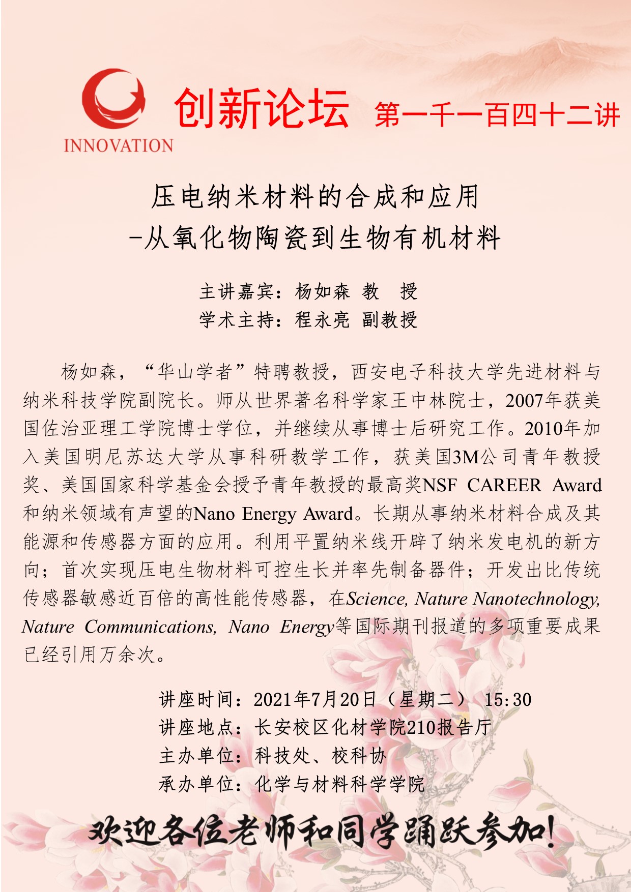 杨如森 教授 广发体育创新论坛第一千一百四十二讲:压电纳米材料的合成和应用-从氧化物陶瓷到生物有机材料 讲座时间 2021年7月20日(星期二) 15:30 讲座地点 长安校区化材学院210报告厅 讲座人介绍 杨如森 教授 讲座内容