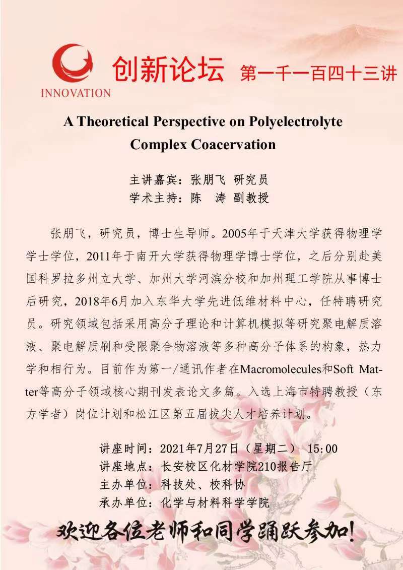 张朋飞 研究员 广发体育创新论坛第一千一百四十三讲:A Theoretical Perspective on Polyelectrolyte Complex Coacervation 讲座时间 2021年7月27日(星期二) 15:00 讲座地点 长安校区化材学院210报告厅 讲座人介绍 张朋飞 研究员 讲座内容