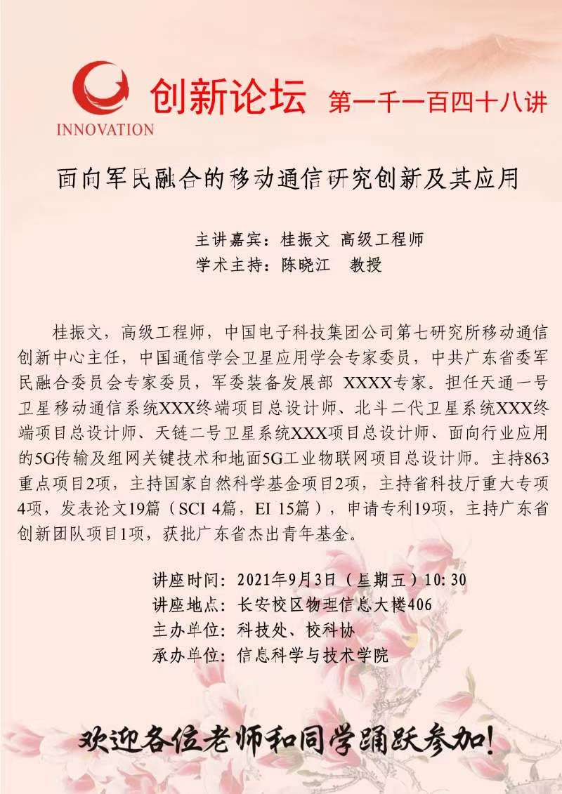 桂振文 高级工程师 广发体育创新论坛第一千一百四十八讲:面向军民融合的移动通信研究创新及其应用 讲座时间 2021年9月3日(星期五)10:30 讲座地点 长安校区物理信息大楼406 讲座人介绍 桂振文 高级工程师 讲座内容