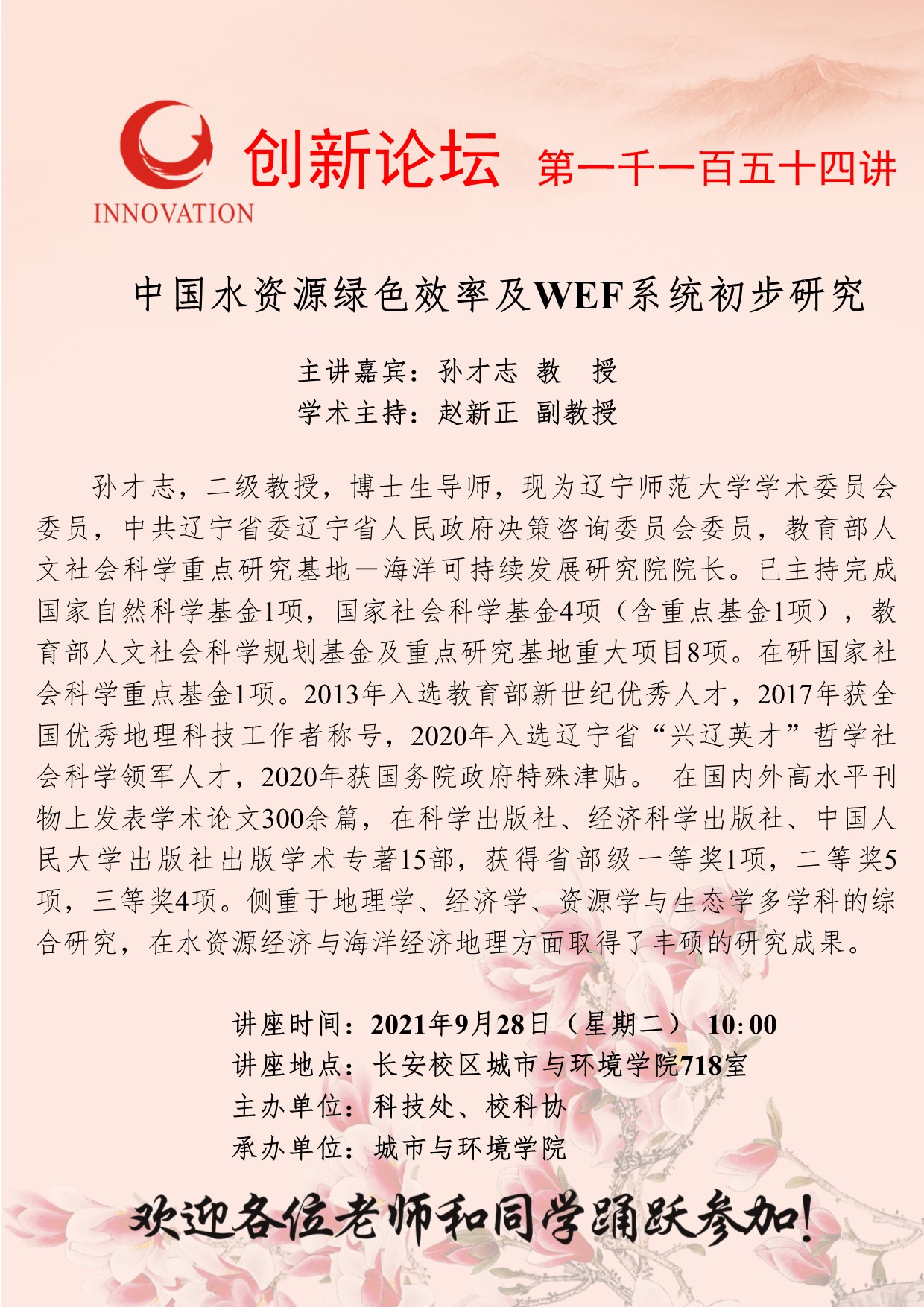 孙才志 教授 广发体育创新论坛第一千一百五十四讲:中国水资源绿色效率及WEF系统初步研究 讲座时间 2021年9月28日(星期二) 10:00 讲座地点 长安校区城市与环境学院718室 讲座人介绍 孙才志 教授 讲座内容