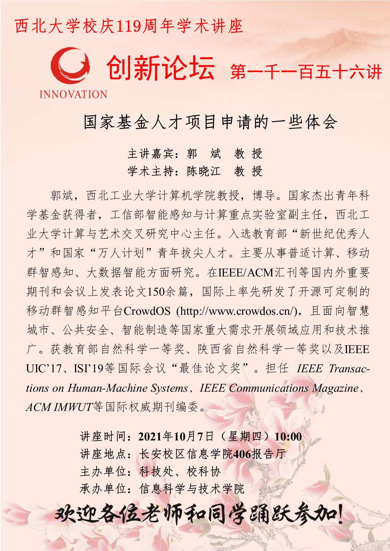 郭斌 教授 广发体育创新论坛第一千一百五十六讲暨校庆119周年学术讲座: 国家基金人才项目申请的一些体会 讲座时间 2021年10月7日(星期四)10:00 讲座地点 长安校区信息学院406报告厅 讲座人介绍 郭斌 教授 讲座内容