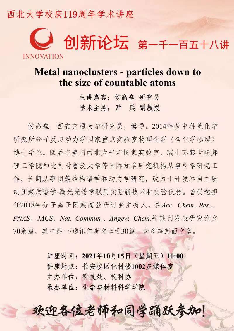 侯高垒 研究员 广发体育创新论坛第一千一百五十八讲暨校庆119周年学术讲座: Metal nanoclusters - particles down to the size of countable atoms 讲座时间 2021年10月15日(星期五)10:00 讲座地点 长安校区化材楼1002多媒体室 讲座人介绍 侯高垒 研究员 讲座内容