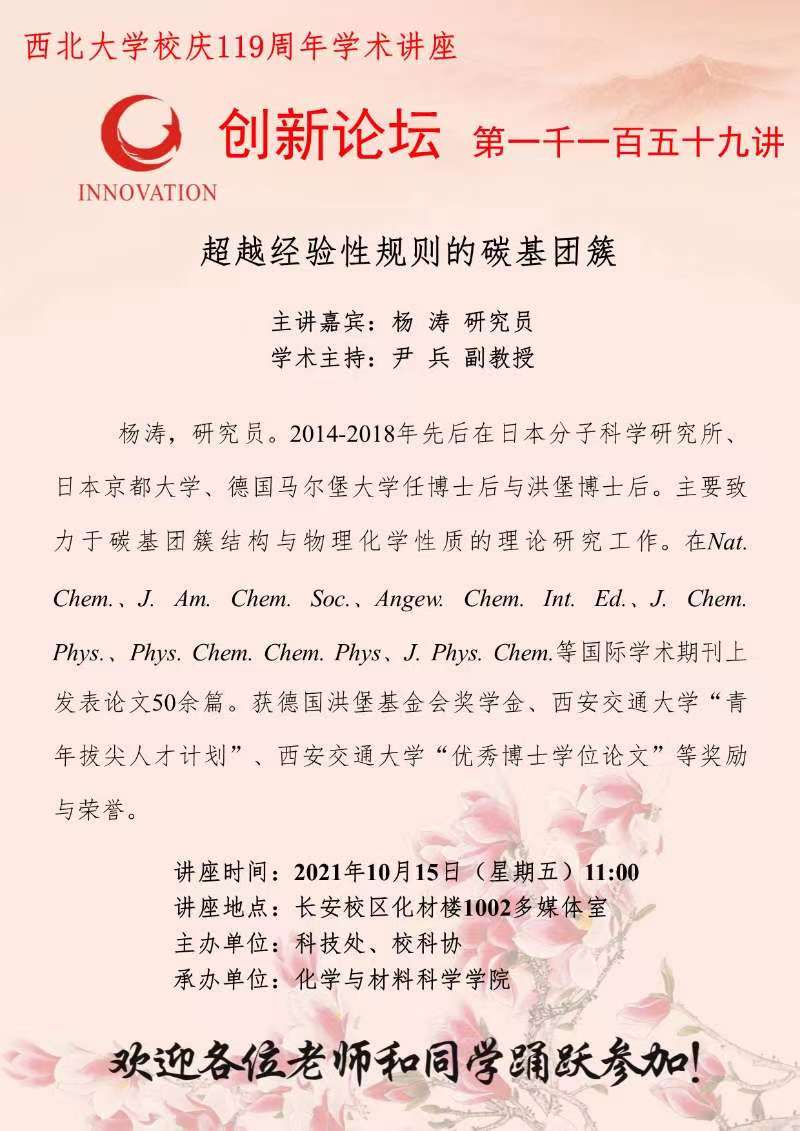 杨涛 研究员 广发体育创新论坛第一千一百五十九讲暨校庆119周年学术讲座:超越经验性规则的碳基团簇 讲座时间 2021年10月15日(星期五)11:00 讲座地点 长安校区化材楼1002多媒体室 讲座人介绍 杨涛 研究员 讲座内容