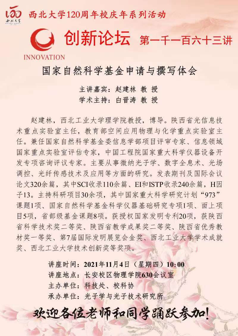 赵建林 教授 广发体育创新论坛第一千一百六十三讲暨120周年校庆年系列活动:国家自然科学基金申请与撰写体会 讲座时间 2021年11月4日(星期四)10:00 讲座地点 长安校区物理学院630会议室 讲座人介绍 赵建林 教授 讲座内容
