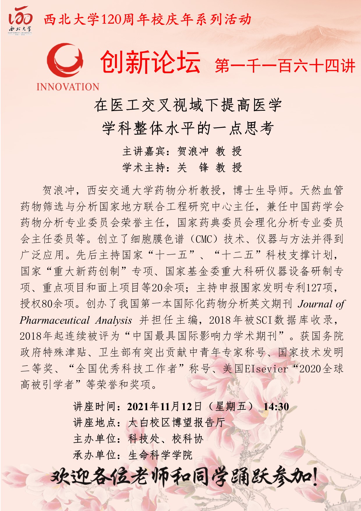 贺浪冲 教授 广发体育创新论坛第一千一百六十四讲暨120周年校庆年系列活动:在医工交叉视域下提高医学学科整体水平的一点思考 讲座时间 2021年11月12日(星期五) 14:30 讲座地点 太白校区博望报告厅 讲座人介绍 贺浪冲 教授 讲座内容