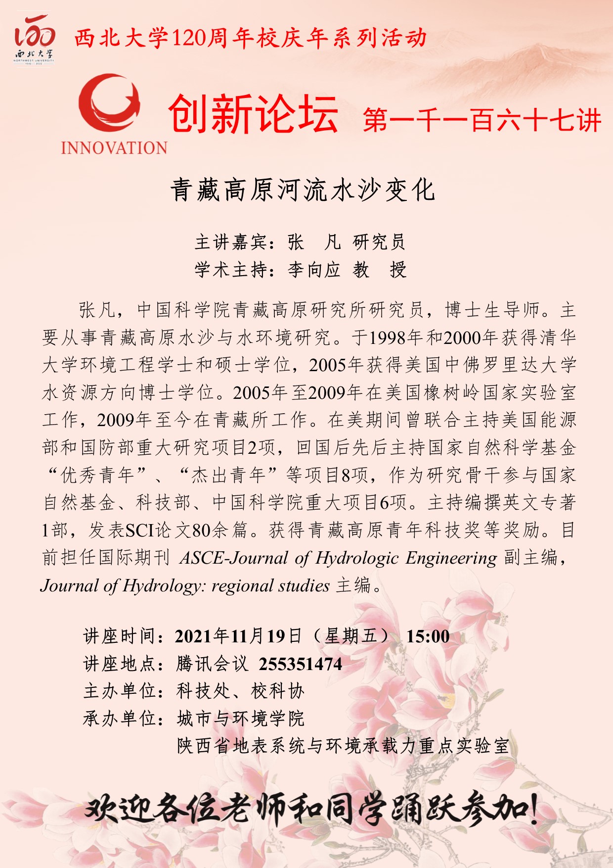 张凡 研究员 广发体育创新论坛第一千一百六十七讲暨120周年校庆年系列活动:青藏高原河流水沙变化 讲座时间 2021年11月19日(星期五) 15:00 讲座地点 腾讯会议 255351474 讲座人介绍 张凡 研究员 讲座内容