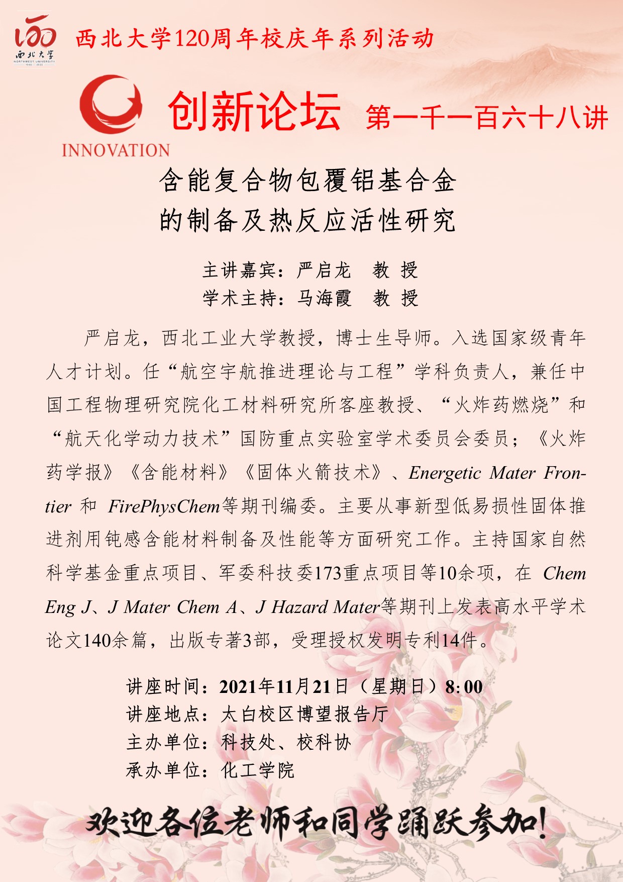 严启龙 教授 广发体育创新论坛第一千一百六十八讲暨120周年校庆年系列活动:含能复合物包覆铝基合金的制备及热反应活性研究 讲座时间 2021年11月21日(星期日)8:00 讲座地点 太白校区博望报告厅 讲座人介绍 严启龙 教授 讲座内容