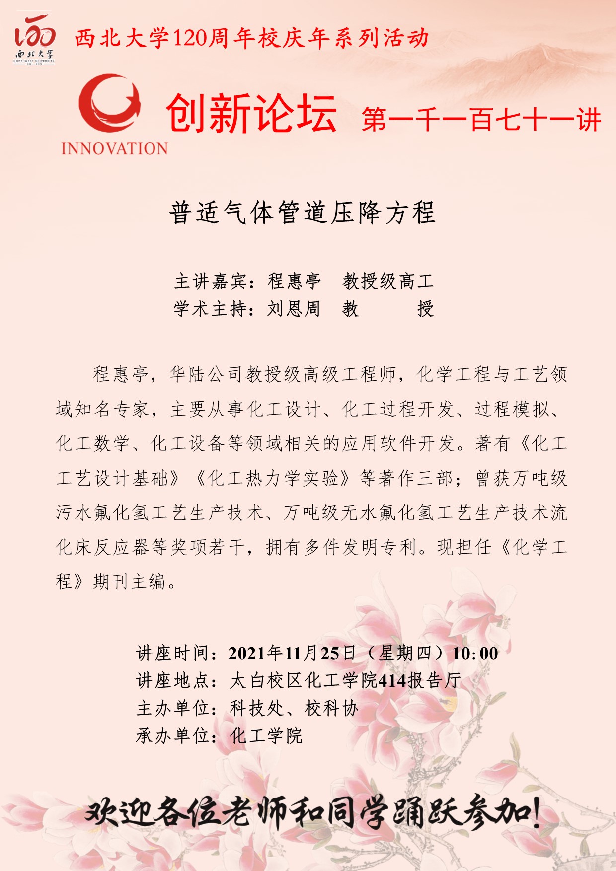 程惠亭 教授级高工 广发体育创新论坛第一千一百七十一讲暨120周年校庆年系列活动:普适气体管道压降方程 讲座时间 2021年11月25日(星期四)10:00 讲座地点 太白校区化工学院414报告厅 讲座人介绍 程惠亭 教授级高工 讲座内容