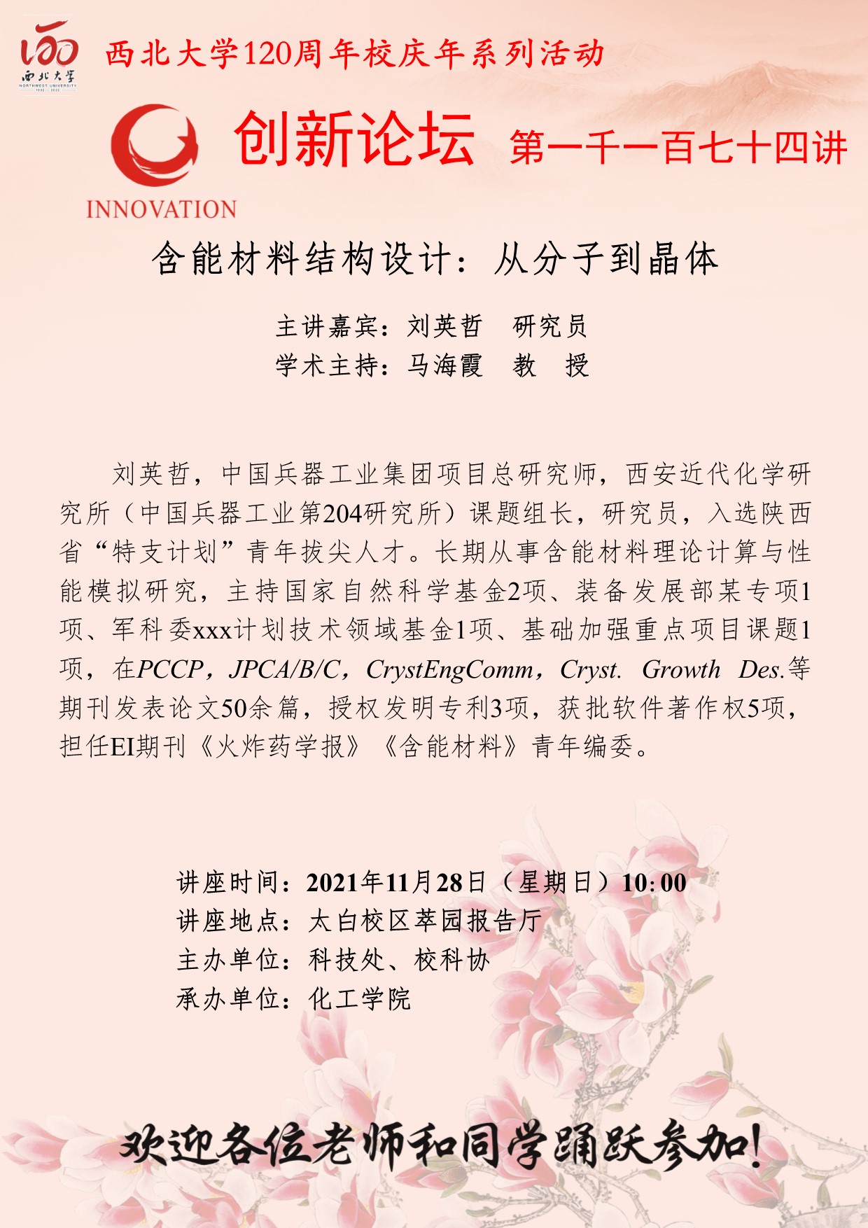 刘英哲 研究员 广发体育创新论坛第一千一百七十四讲暨120周年校庆年系列活动:含能材料结构设计: 从分子到晶体 讲座时间 2021年11月28日(星期日)10:00 讲座地点 太白校区萃园报告厅 讲座人介绍 刘英哲 研究员 讲座内容