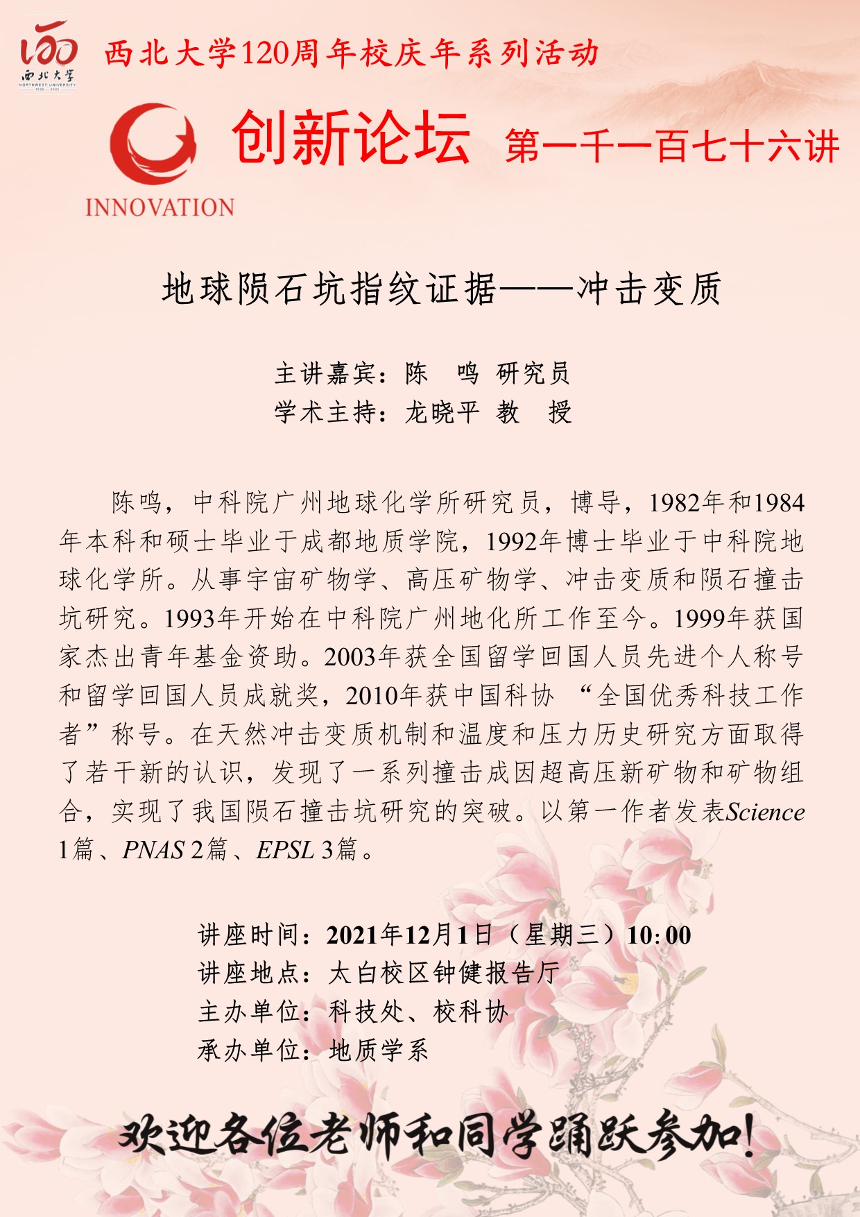 陈鸣 研究员 广发体育创新论坛第一千一百七十六讲暨120周年校庆年系列活动:地球陨石坑指纹证据——冲击变质 讲座时间 2021年12月1日(星期三)10:00 讲座地点 太白校区钟健报告厅 讲座人介绍 陈鸣 研究员 讲座内容