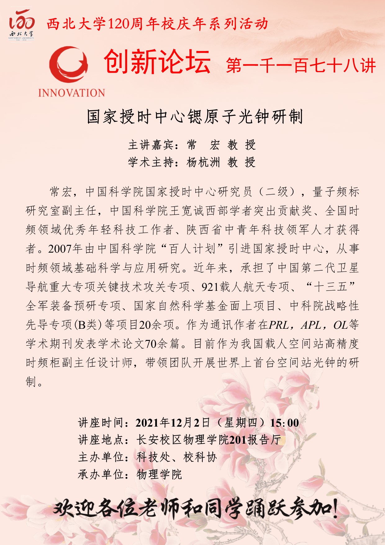 常宏 教授 广发体育创新论坛第一千一百七十八讲暨120周年校庆年系列活动:国家授时中心锶原子光钟研制 讲座时间 2021年12月2日(星期四)15:00 讲座地点 长安校区物理学院201报告厅 讲座人介绍 常宏 教授 讲座内容