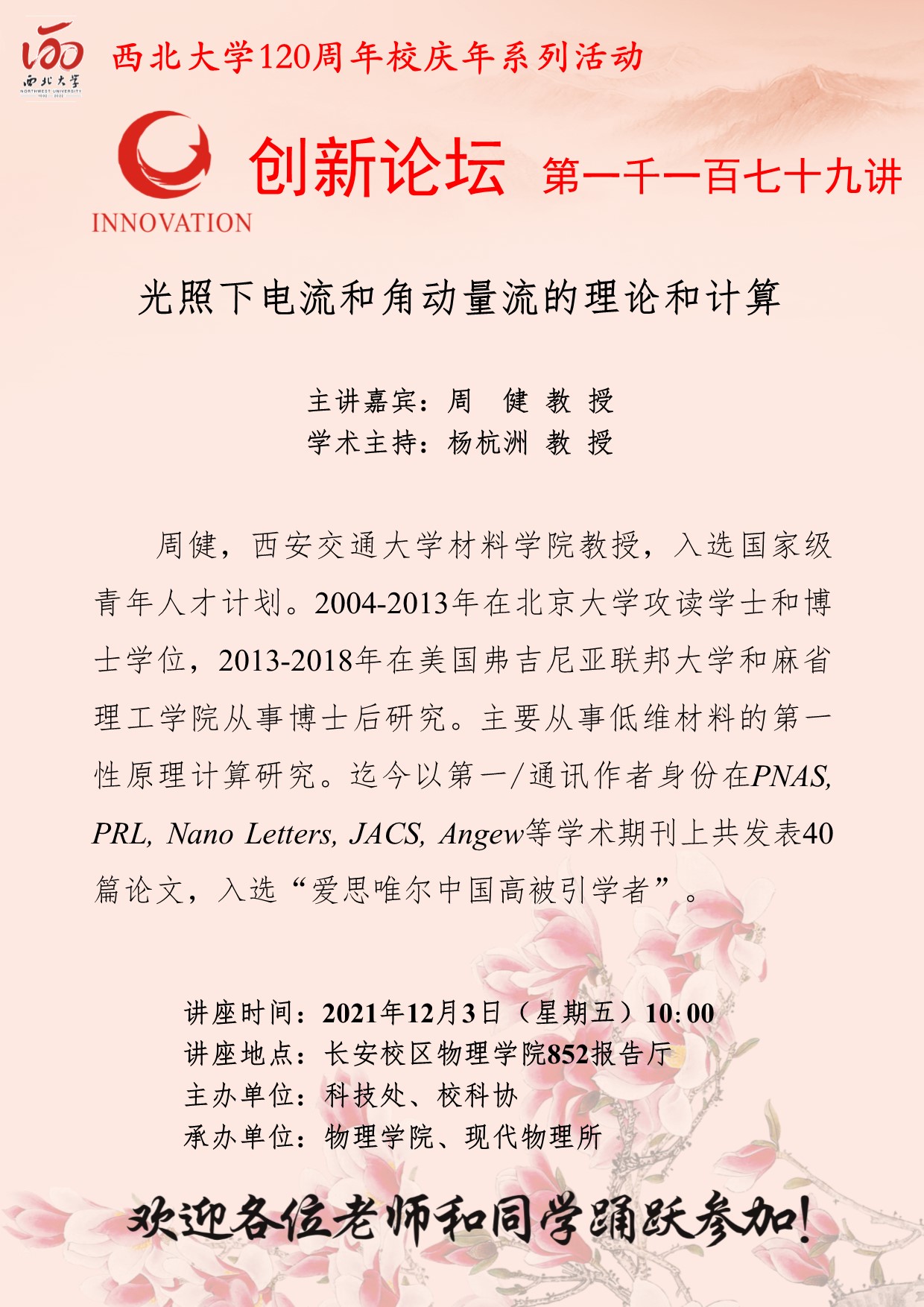 周健 教授 广发体育创新论坛第一千一百七十九讲暨120周年校庆年系列活动:光照下电流和角动量流的理论和计算 讲座时间 2021年12月3日(星期五)10:00 讲座地点 长安校区物理学院852报告厅 讲座人介绍 周健 教授 讲座内容