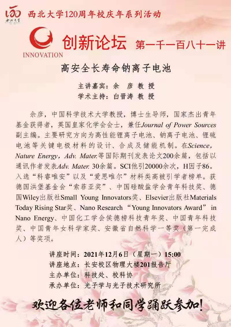 余彦 教授 广发体育创新论坛第一千一百八十一讲暨120周年校庆年系列活动:高安全长寿命钠离子电池 讲座时间 2021年12月6日(星期一)15:00 讲座地点 长安校区物理大楼201报告厅 讲座人介绍 余彦 教授 讲座内容