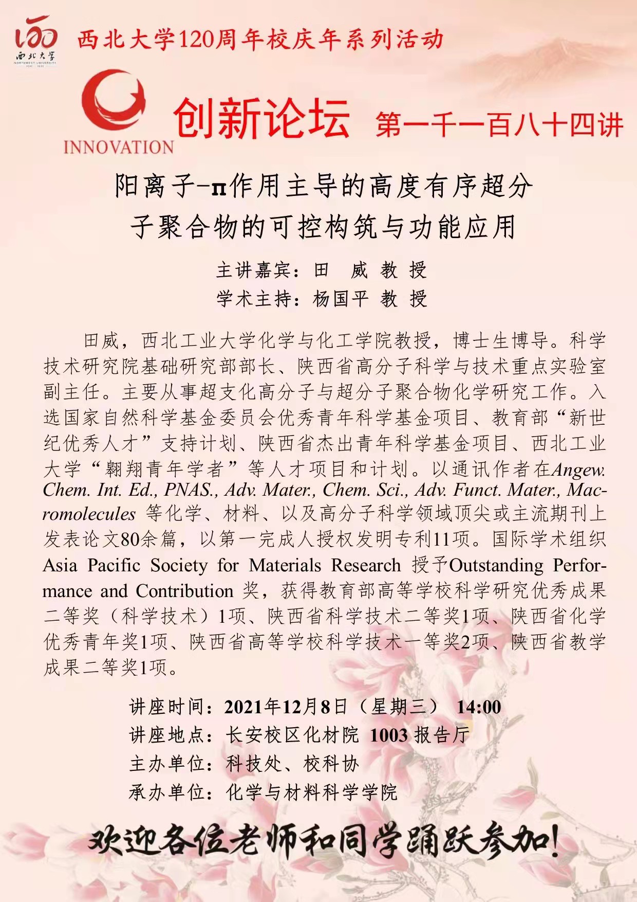 田威 教授 广发体育创新论坛第一千一百八十四讲暨120周年校庆年系列活动:阳离子-π作用主导的高度有序超分子聚合物的可控构筑与功能应用 讲座时间 2021年12月8日(星期三) 14:00 讲座地点 长安校区化材院 1003 报告厅 讲座人介绍 田威 教授 讲座内容