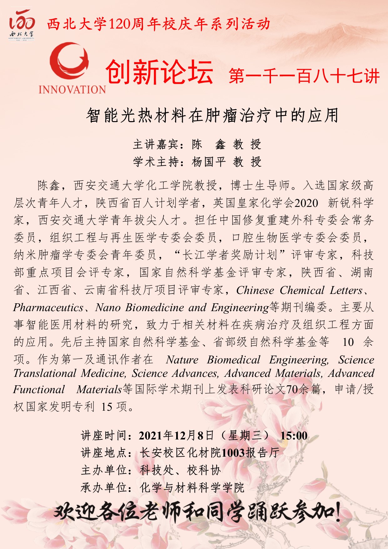 陈鑫 教授 广发体育创新论坛第一千一百八十七讲暨120周年校庆年系列活动:智能光热材料在肿瘤治疗中的应用 讲座时间 2021年12月8日(星期三) 15:00 讲座地点 长安校区化材院1003报告厅 讲座人介绍 陈鑫 教授 讲座内容