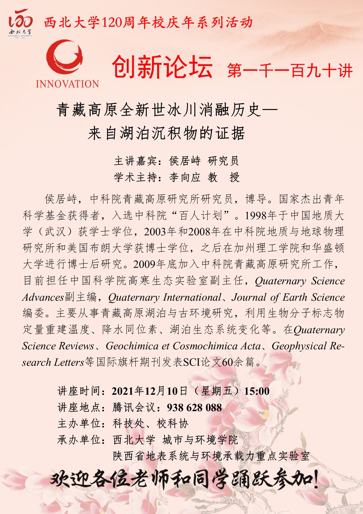 侯居峙 研究员 广发体育创新论坛第一千一百九十讲暨120周年校庆年系列活动:青藏高原全新世冰川消融历史—来自湖泊沉积物的证据 讲座时间 2021年12月10日(星期五)15:00 讲座地点 腾讯会议:938628088 讲座人介绍 侯居峙 研究员 讲座内容