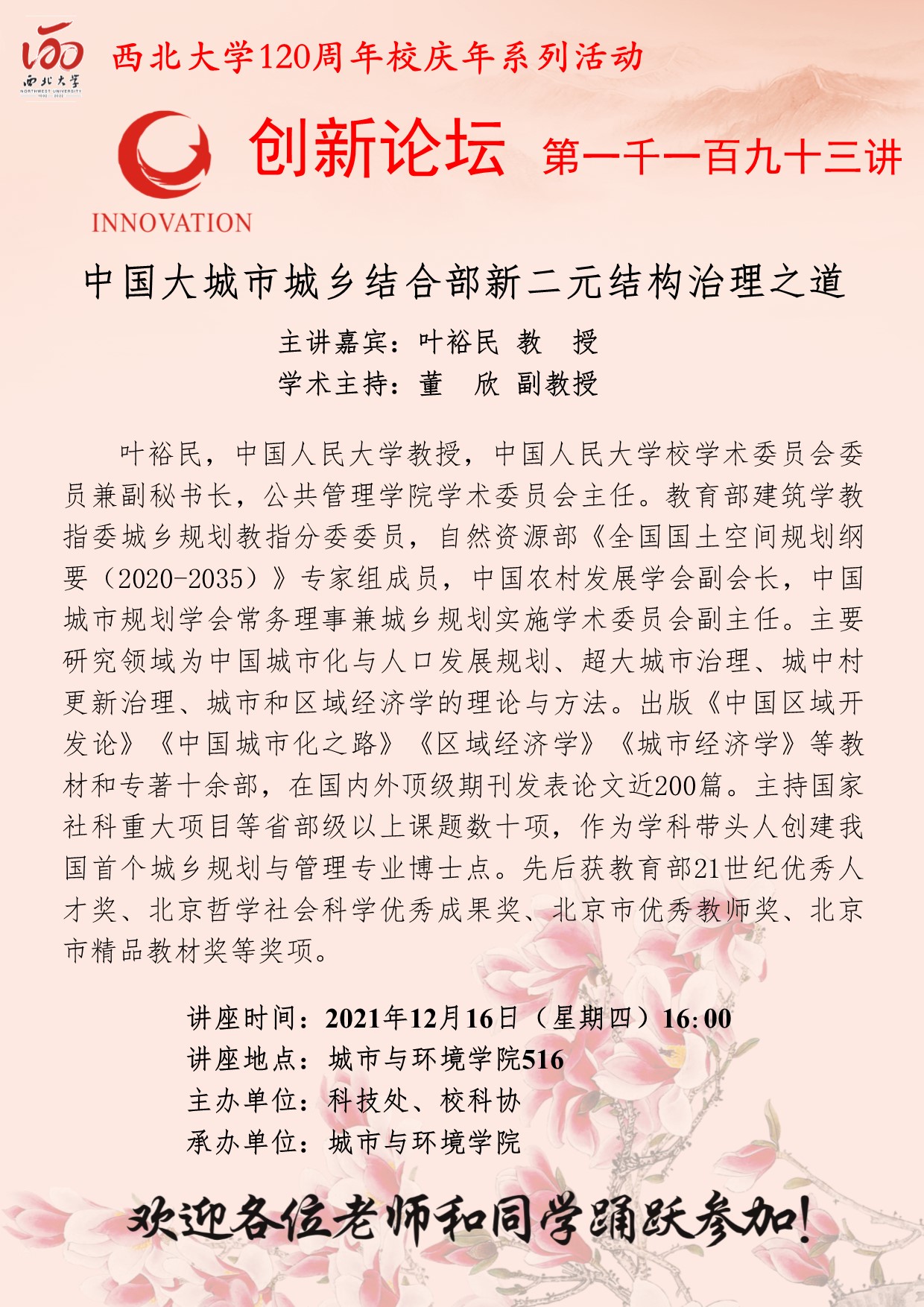 叶裕民 教授 广发体育创新论坛第一千一百九十三讲暨120周年校庆年系列活动:中国大城市城乡结合部新二元结构治理之道 讲座时间 2021年12月16日(星期四)16:00 讲座地点 城市与环境学院516 讲座人介绍 叶裕民 教授 讲座内容