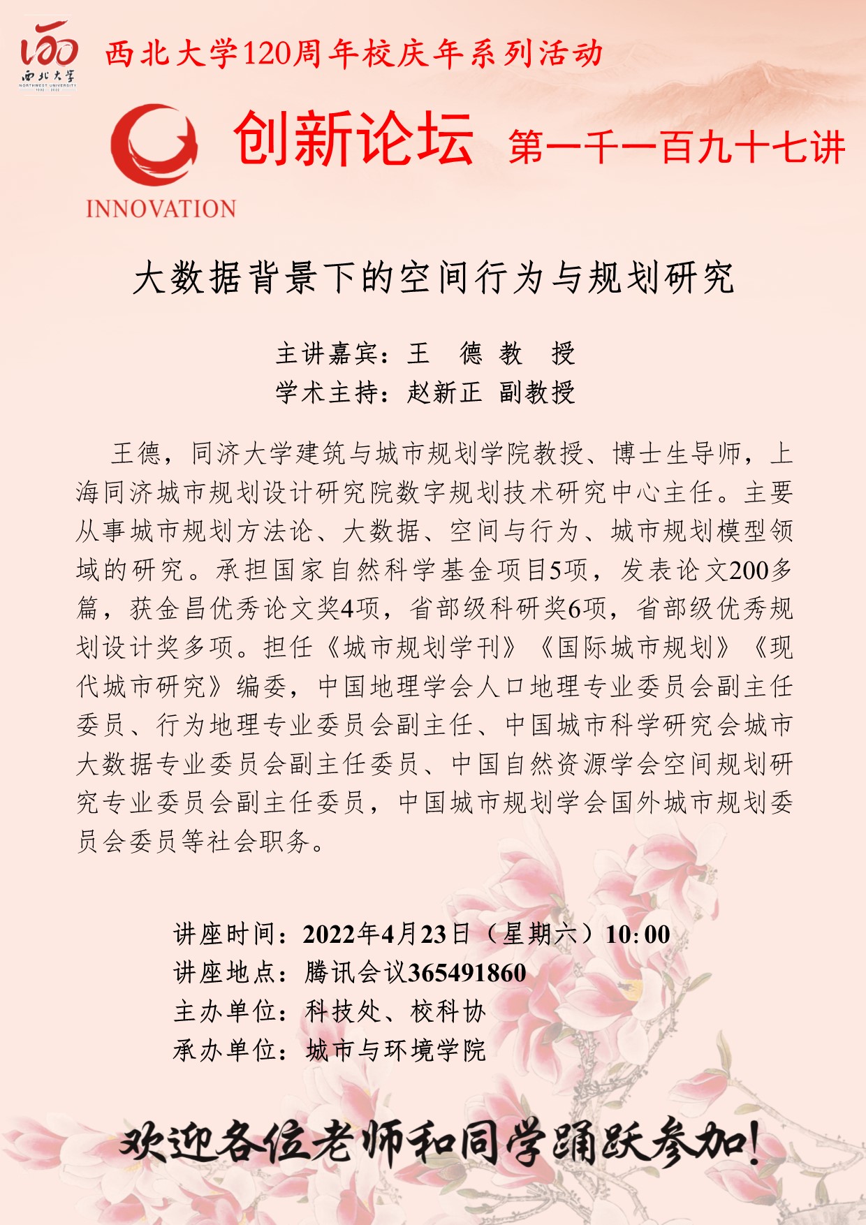 王德 教授 广发体育创新论坛第一千一百九十七讲暨120周年校庆年系列活动:大数据背景下的空间行为与规划研究 讲座时间 2022年4月23日(星期六)10:00 讲座地点 腾讯会议:365491860 讲座人介绍 王德 教授 讲座内容