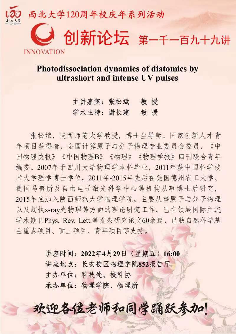 张松斌 教授 广发体育创新论坛第一千一百九十九讲暨120周年校庆年系列活动:Photodissociation dynamics of diatomics by ultrashort and intense UV pulses 讲座时间 2022年4月29日(星期五)16:00 讲座地点 长安校区物理学院852报告厅 讲座人介绍 张松斌 教授 讲座内容