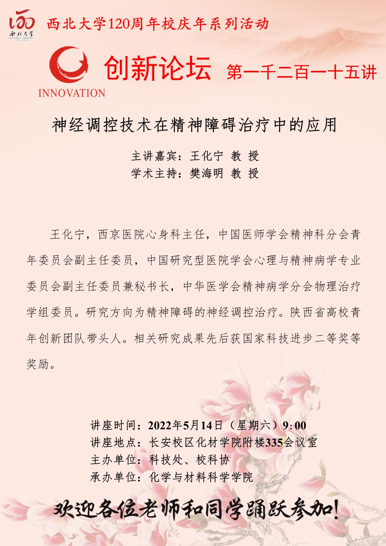 王化宁 教授 广发体育创新论坛第一千二百一十五讲暨120周年校庆年系列活动:神经调控技术在精神障碍治疗中的应用 讲座时间 2022年5月14日(星期六)9:00 讲座地点 长安校区化材学院附楼335会议室 讲座人介绍 王化宁 教授 讲座内容
