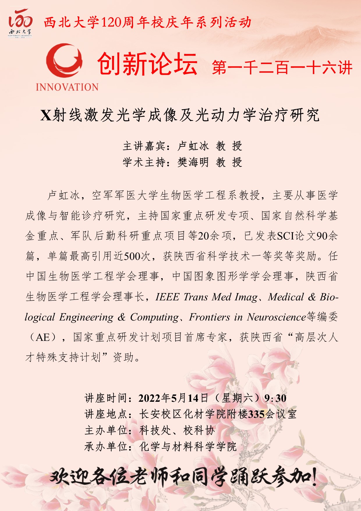 卢虹冰 教授 广发体育创新论坛第一千二百一十六讲暨120周年校庆年系列活动:X射线激发光学成像及光动力学治疗研究 讲座时间 2022年5月14日(星期六)9:30 讲座地点 长安校区化材学院附楼335会议室 讲座人介绍 卢虹冰 教授 讲座内容