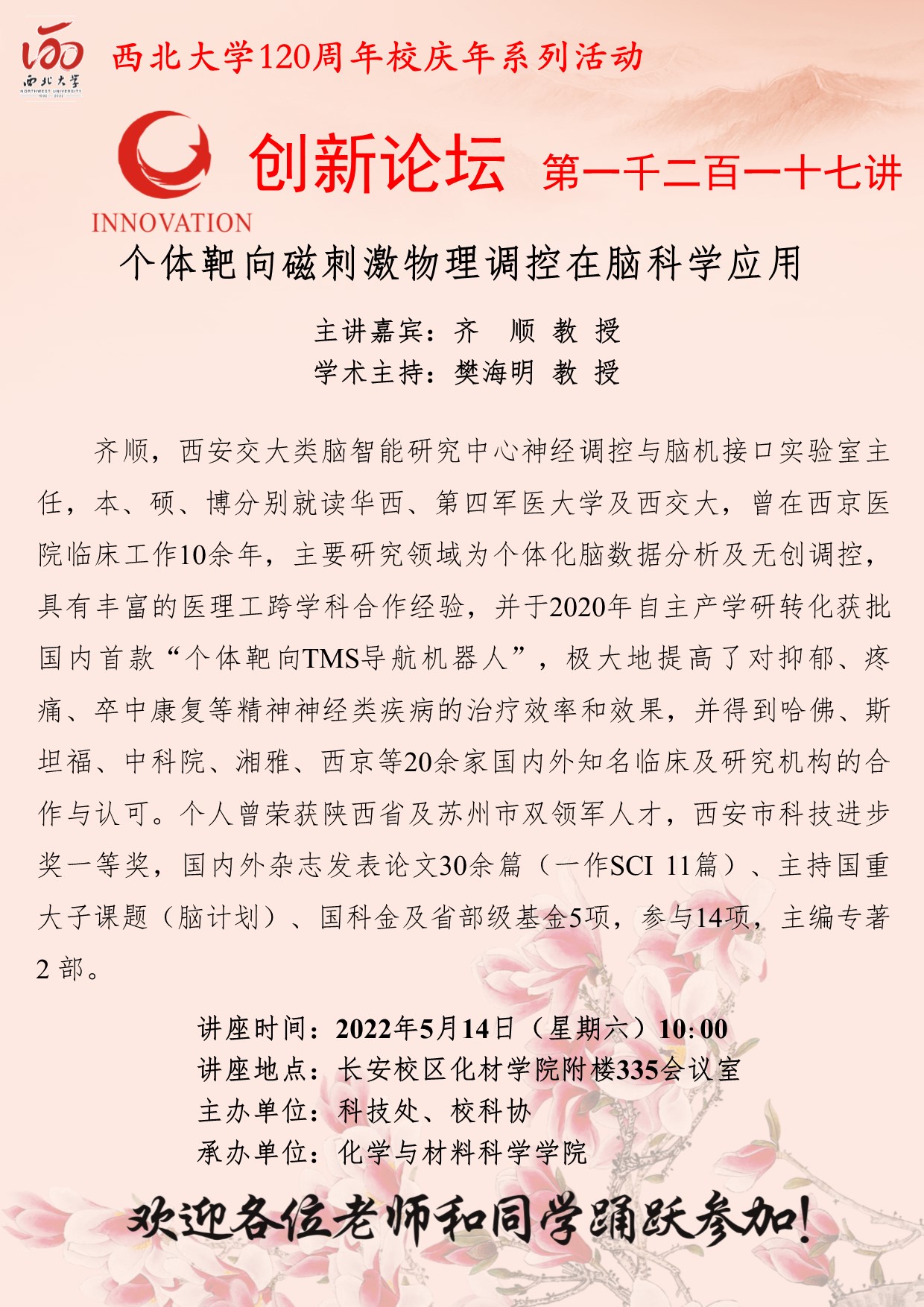 齐顺 教授 广发体育创新论坛第一千二百一十七讲暨120周年校庆年系列活动:个体靶向磁刺激物理调控在脑科学应用 讲座时间 2022年5月14日(星期六)10:00 讲座地点 长安校区化材学院附楼335会议室 讲座人介绍 齐顺 教授 讲座内容