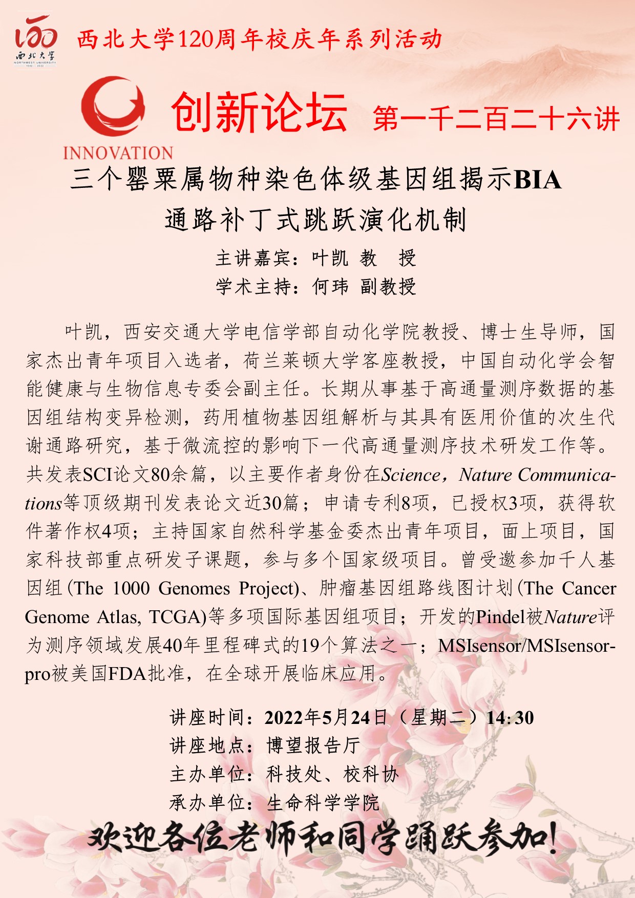 叶凯 教授 广发体育创新论坛第一千二百二十六讲暨120周年校庆年系列活动:三个罂粟属物种染色体级基因组揭示BIA通路补丁式跳跃演化机制 讲座时间 2022年5月24日(星期二)14:30 讲座地点 博望报告厅 讲座人介绍 叶凯 教授 讲座内容
