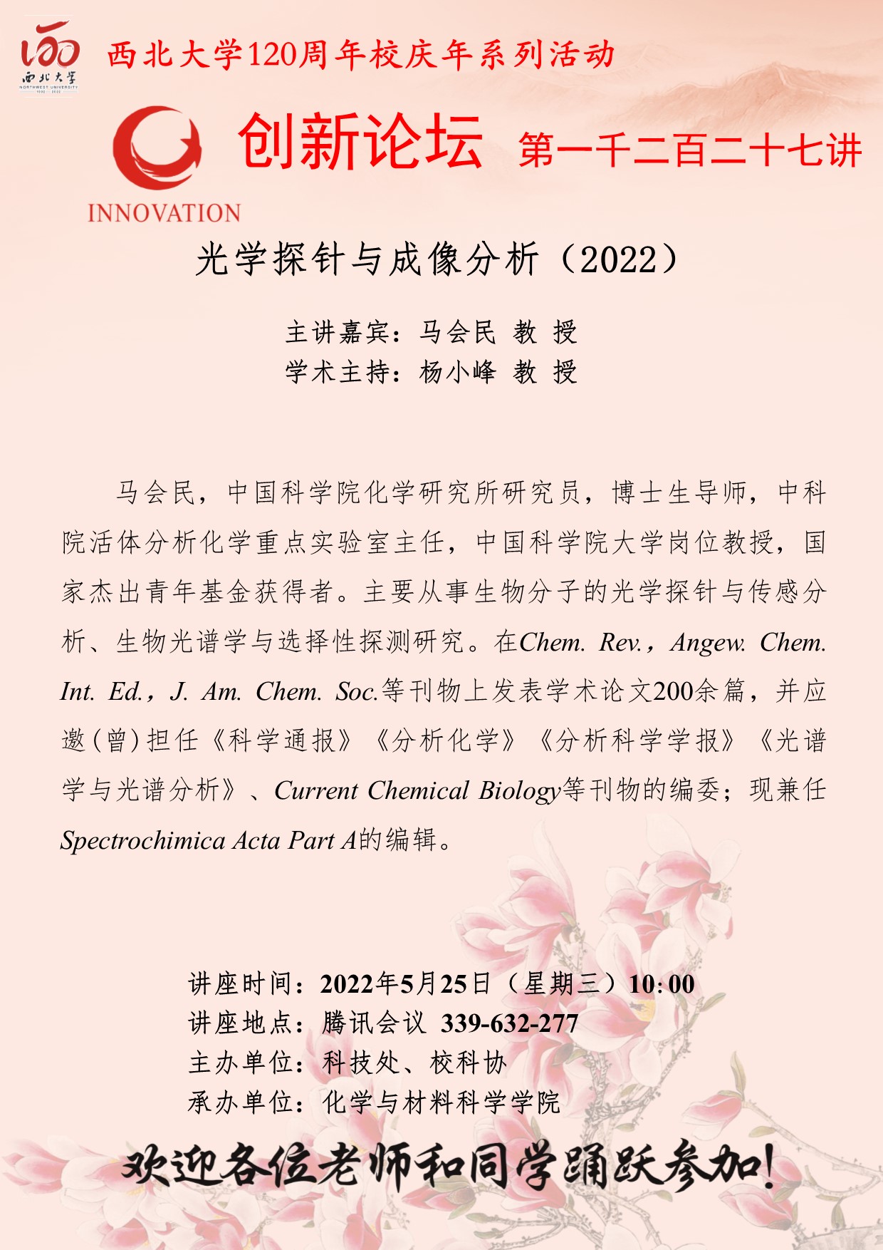 马会民 教授 广发体育创新论坛第一千二百二十七讲暨120周年校庆年系列活动:光学探针与成像分析(2022) 讲座时间 2022年5月25日(星期三)10:00 讲座地点 腾讯会议 339-632-277 讲座人介绍 马会民 教授 讲座内容