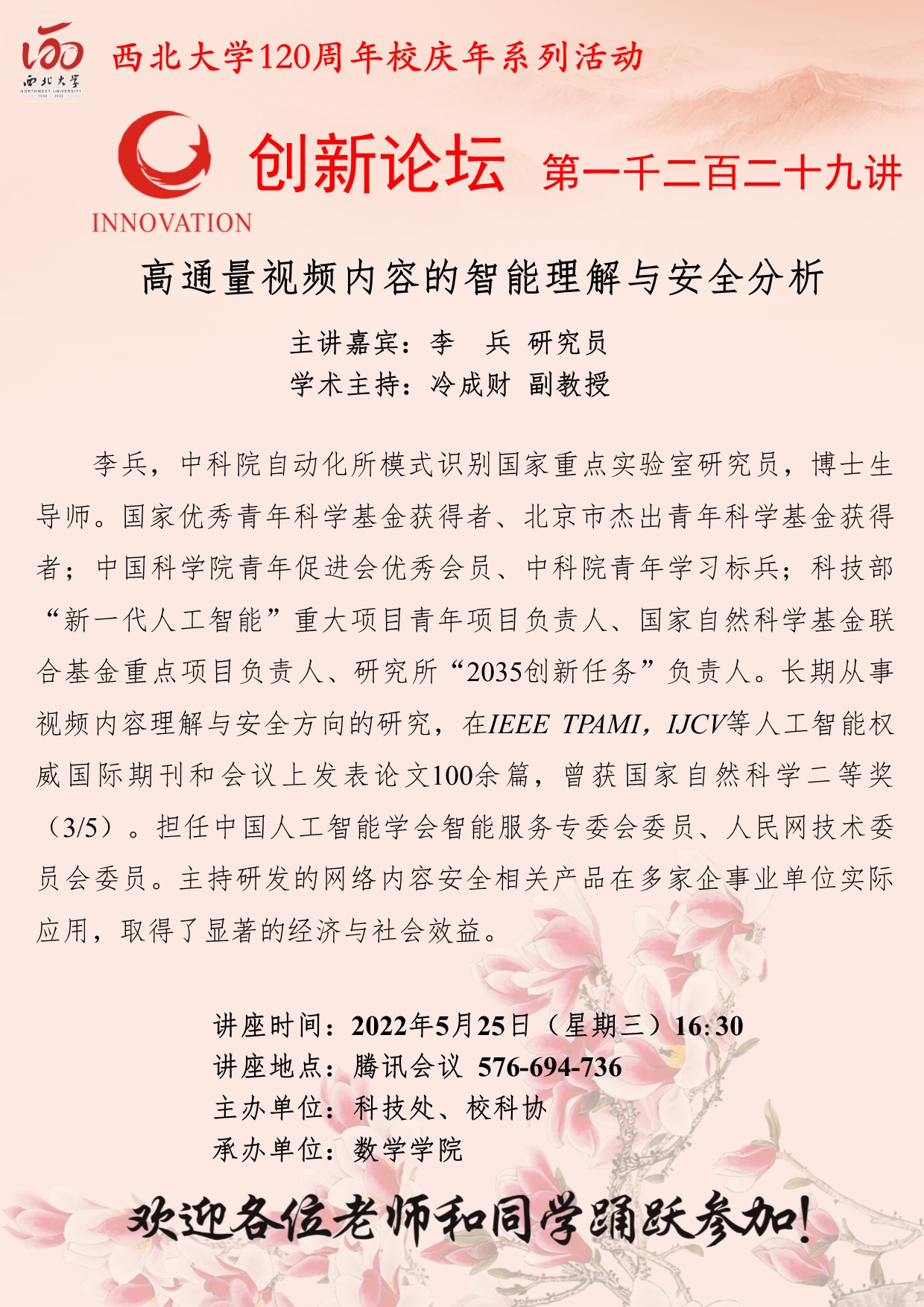 李兵 研究员 广发体育创新论坛第一千二百二十九讲暨120周年校庆年系列活动:高通量视频内容的智能理解与安全分析 讲座时间 2022年5月25日(星期三)16:30 讲座地点 腾讯会议 576-694-736 讲座人介绍 李兵 研究员 讲座内容