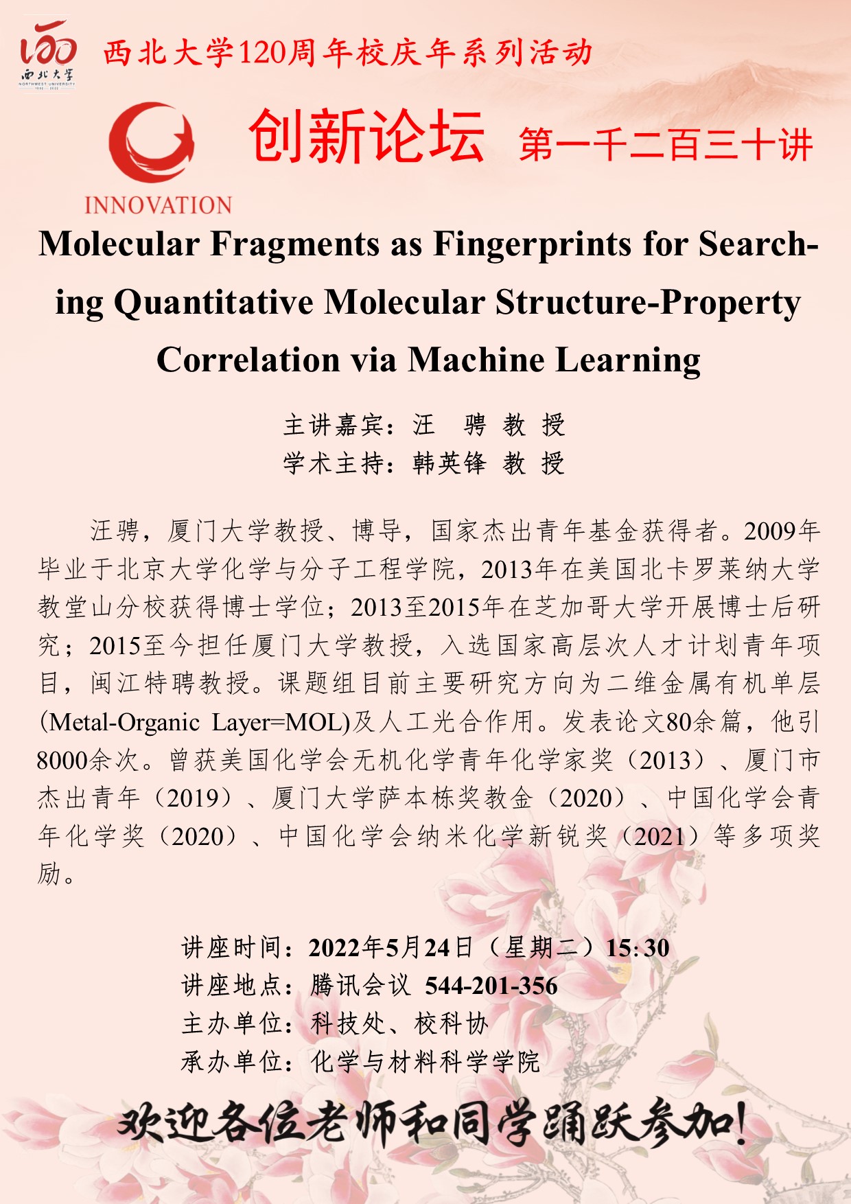 汪骋 教授 广发体育创新论坛第一千二百三十讲暨120周年校庆年系列活动:Molecular Fragments as Fingerprints for Searching Quantitative Molecular Structure-Property Correlation via Machine Learning 讲座时间 2022年5月24日(星期二)15:30 讲座地点 腾讯会议 544-201-356 讲座人介绍 汪骋 教授 讲座内容