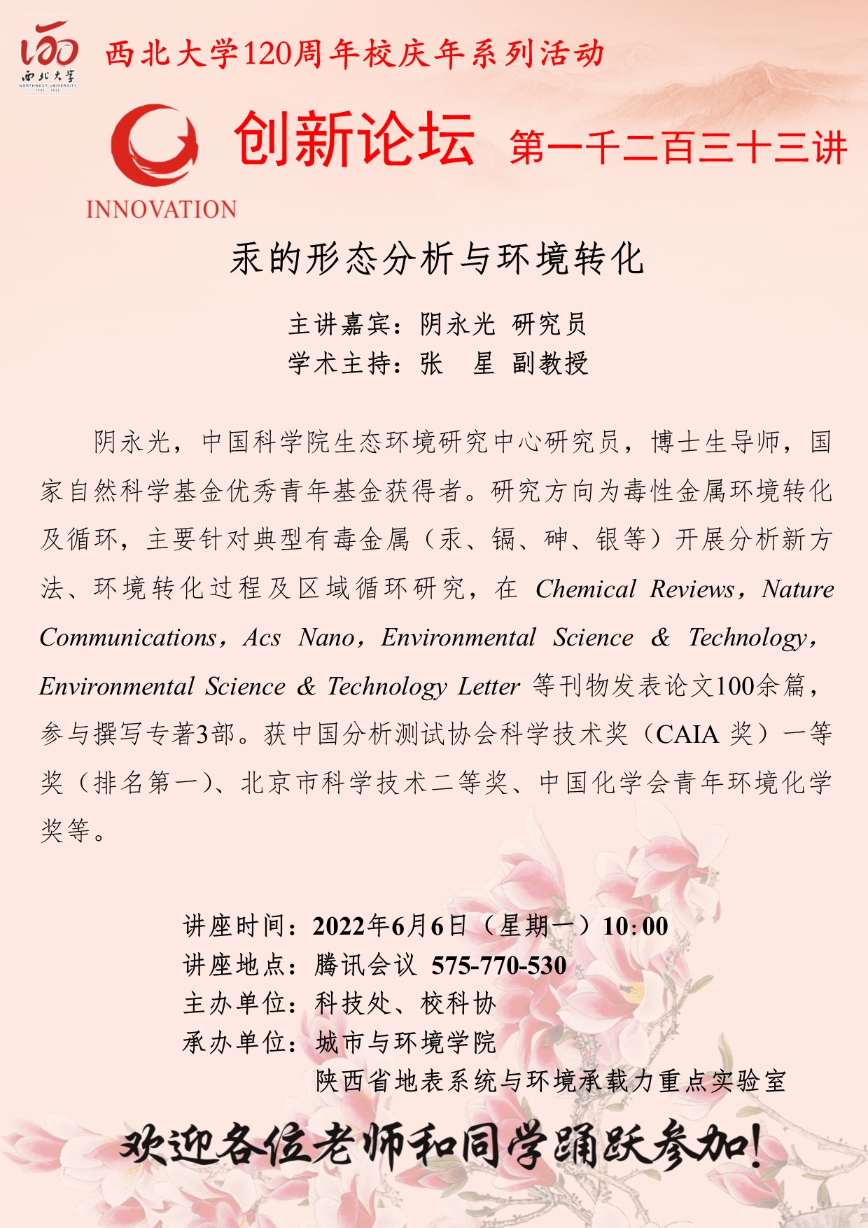 阴永光 研究员 广发体育创新论坛第一千二百三十三讲暨120周年校庆年系列活动:汞的形态分析与环境转化 讲座时间 2022年6月6日(星期一)10:00 讲座地点 腾讯会议 575-770-530 讲座人介绍 阴永光 研究员 讲座内容