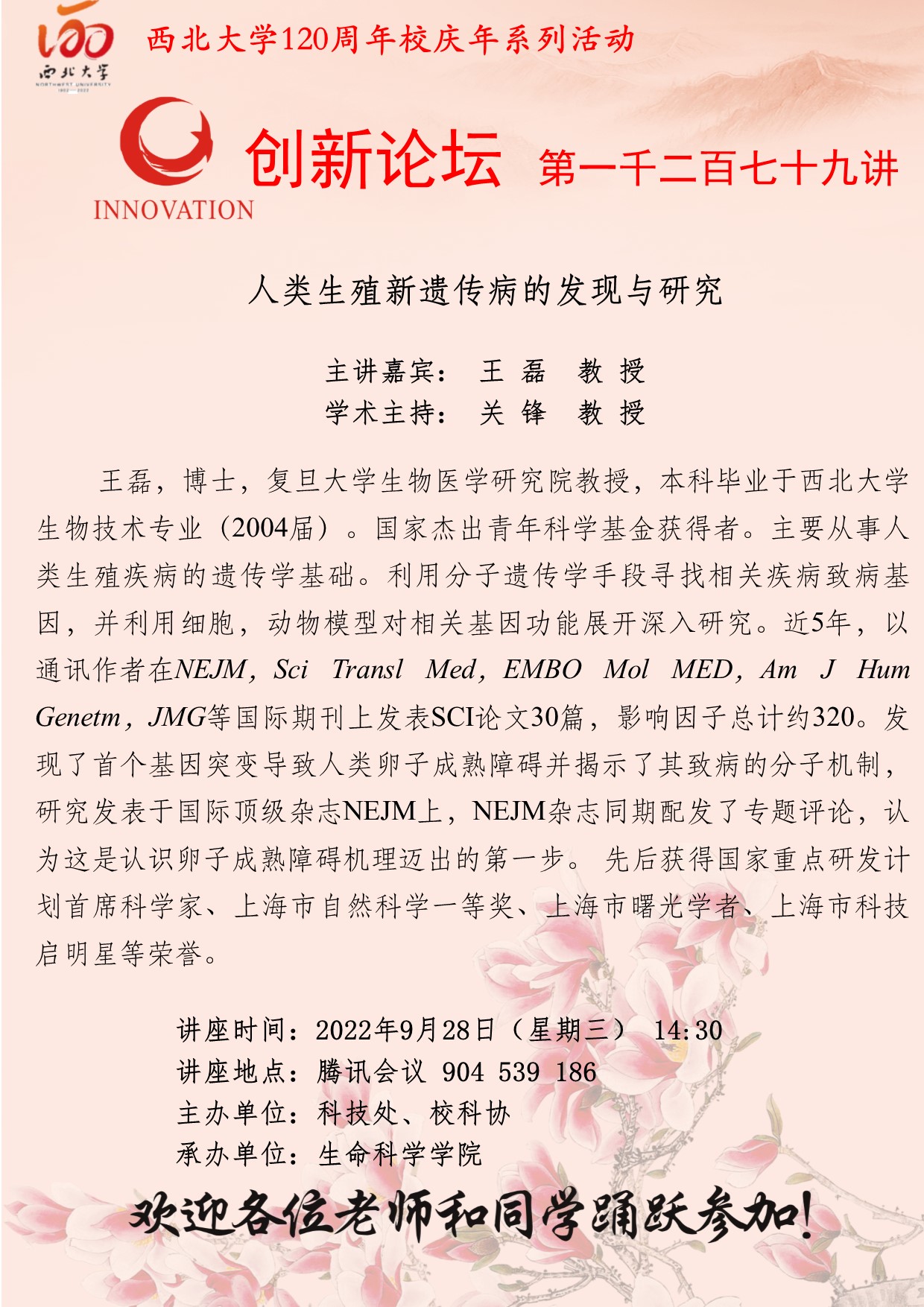 王 磊 教 授 广发体育创新论坛第一千二百七十九讲暨120周年校庆年系列活动:人类生殖新遗传病的发现与研究 讲座时间 2022年9月28日(星期三) 14:30 讲座地点 腾讯会议 904 539 186 讲座人介绍 王 磊 教 授 讲座内容