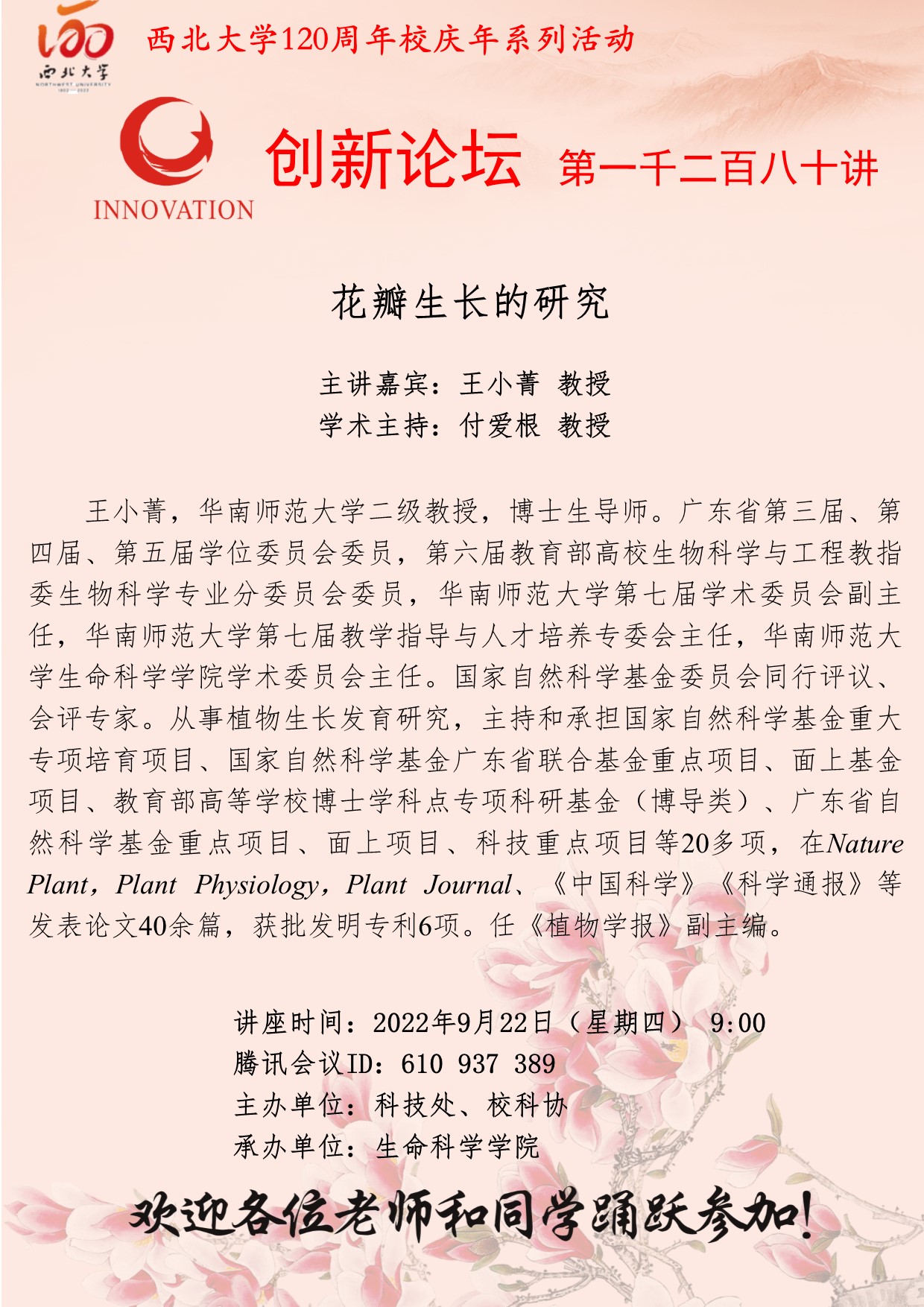 王小菁 教授 广发体育创新论坛第一千二百八十讲暨120周年校庆年系列活动:花瓣生长的研究 讲座时间 2022年9月22日(星期四) 9:00 讲座地点 腾讯会议ID:610 937 389 讲座人介绍 王小菁 教授 讲座内容