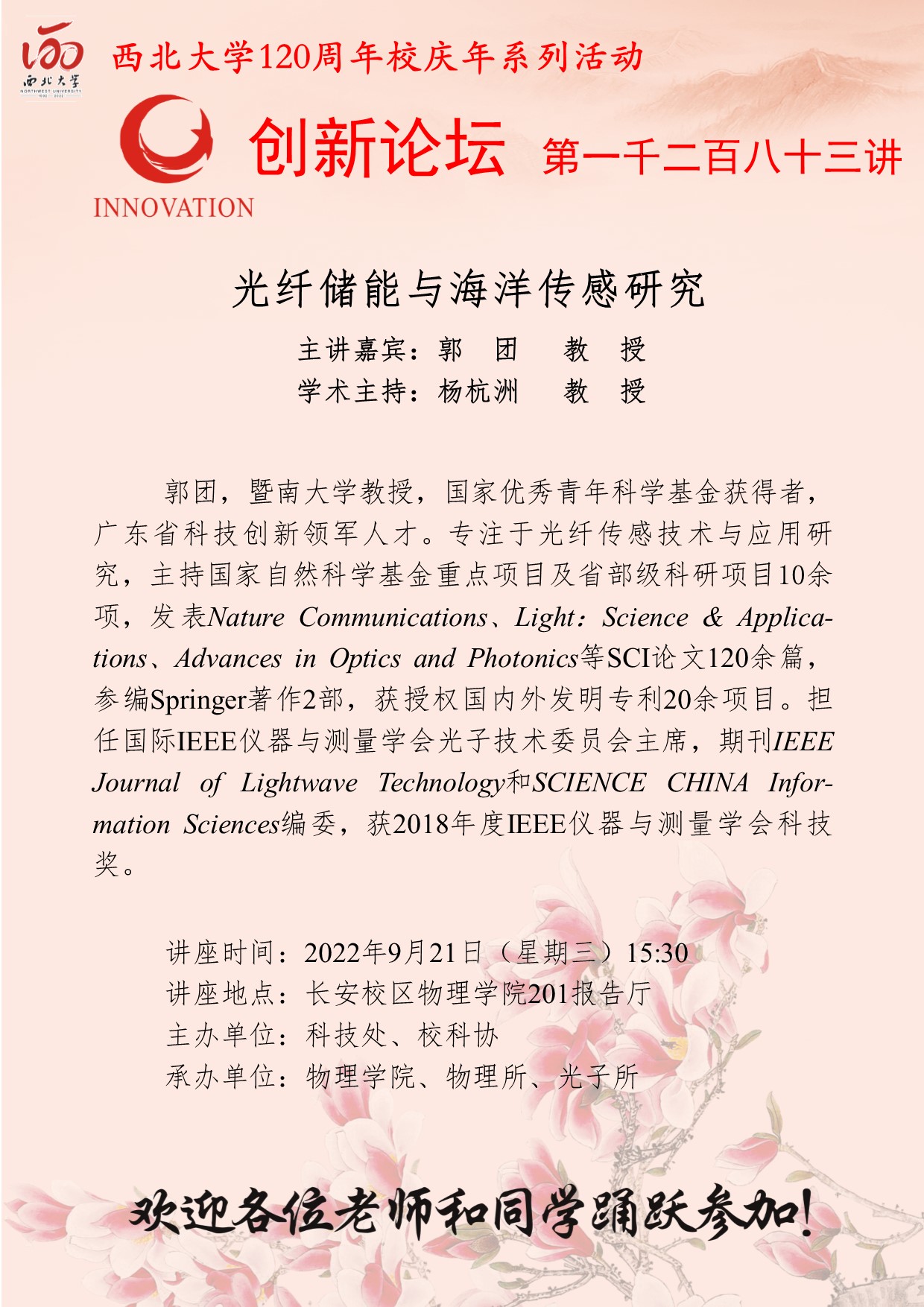 郭团 教授 广发体育创新论坛第一千二百八十三讲暨120周年校庆年系列活动::光纤储能与海洋传感研究 讲座时间 2022年9月21日(星期三) 15:30 讲座地点 物理学院201报告厅 讲座人介绍 郭团 教授 讲座内容