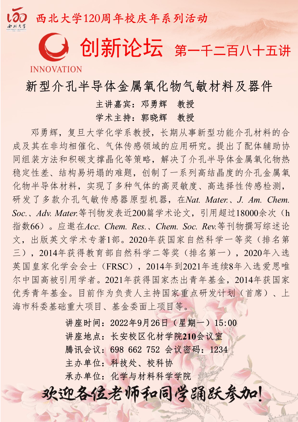 邓勇辉 教授 广发体育创新论坛第一千二百八十五讲暨120周年校庆年系列活动::新型介孔半导体金属氧化物气敏材料及器件 讲座时间 2022年9月26日(星期一) 15:00 讲座地点 长安校区化材院210会议室(腾讯会议:698 662 752,会议密码:1234) 讲座人介绍 邓勇辉 教授 讲座内容