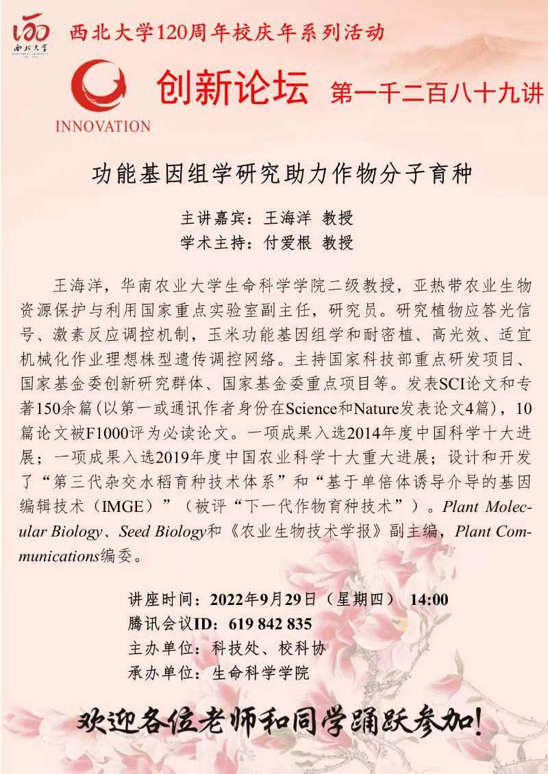 王海洋 教授 广发体育创新论坛第一千二百八十九讲暨120周年校庆年系列活动: 功能基因组学研究助力作物分子育种 讲座时间 2022年9月29日(星期四) 14:00 讲座地点 腾讯会议 619 842 835 讲座人介绍 王海洋 教授 讲座内容