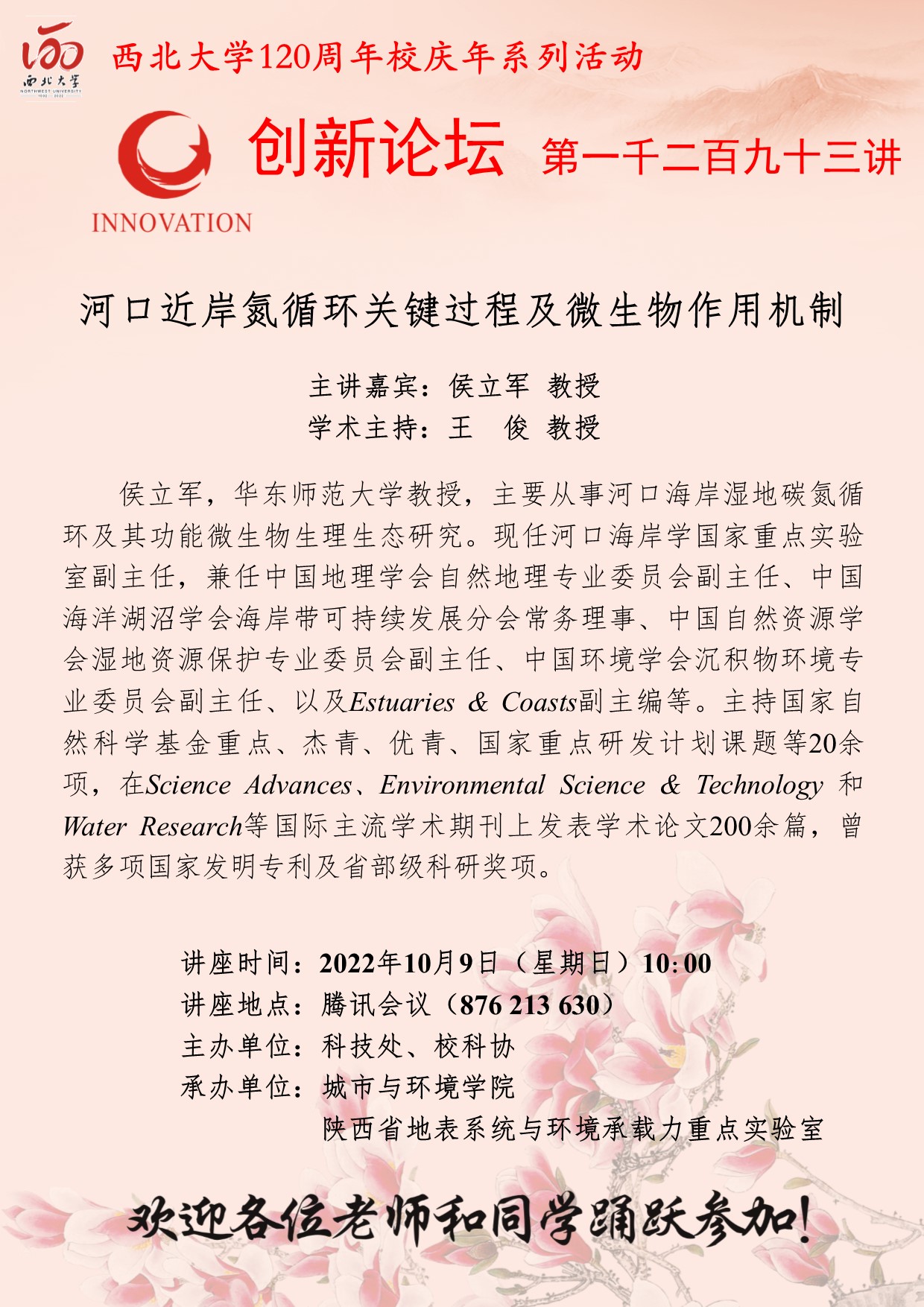 侯立军 教授 广发体育创新论坛第一千二百九十三讲暨120周年校庆年系列活动: 河口近岸氮循环关键过程及微生物作用机制 讲座时间 2022年10月9日(星期日)10:00 讲座地点 腾讯会议(876 213 630) 讲座人介绍 侯立军 教授 讲座内容