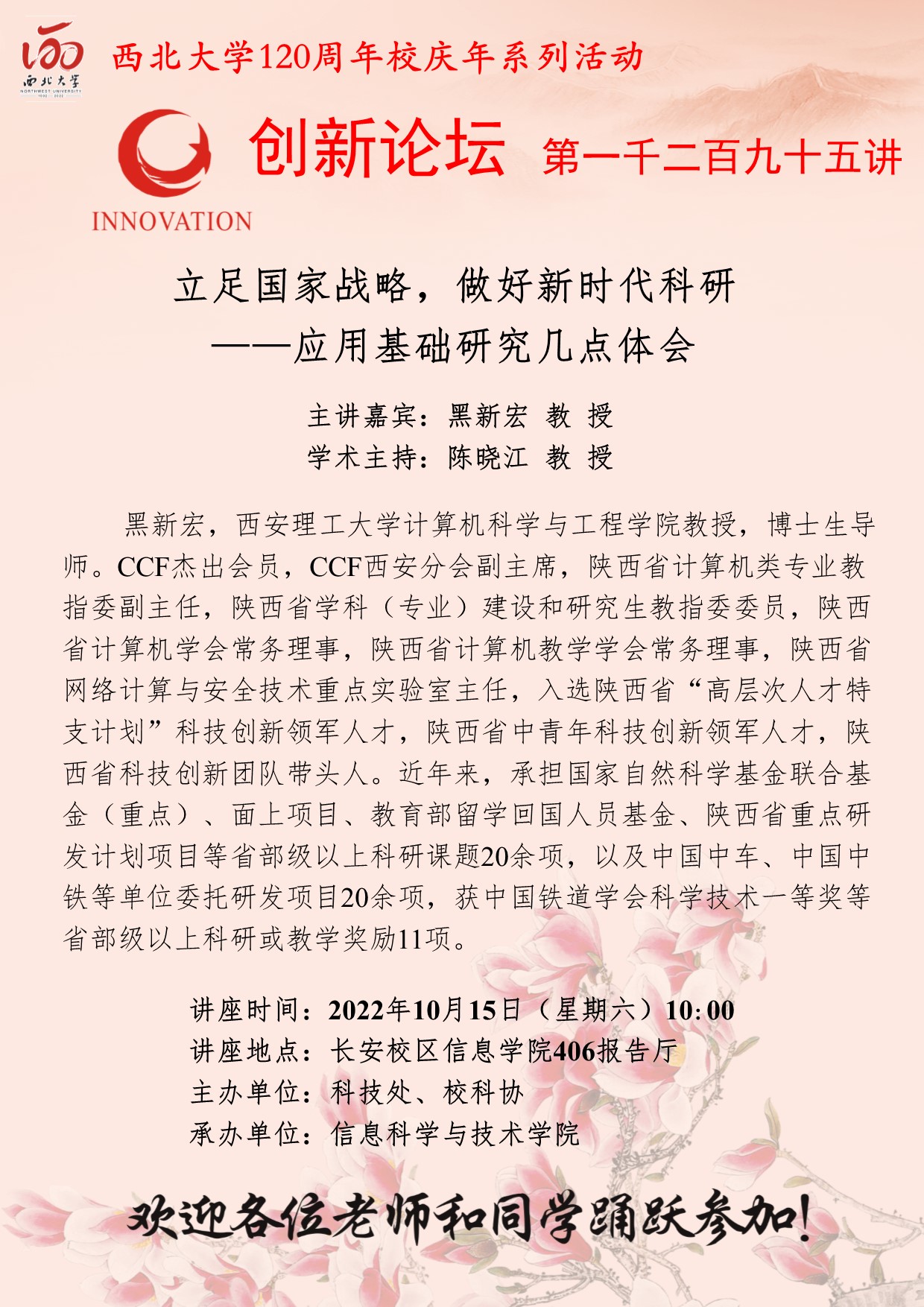 黑新宏 教授 广发体育创新论坛第一千二百九十五讲暨120周年校庆年系列活动: 立足国家战略,做好新时代科研——应用基础研究几点体会 讲座时间 2022年10月15日(星期六)10:00 讲座地点 长安校区信息学院406报告厅 讲座人介绍 黑新宏 教授 讲座内容