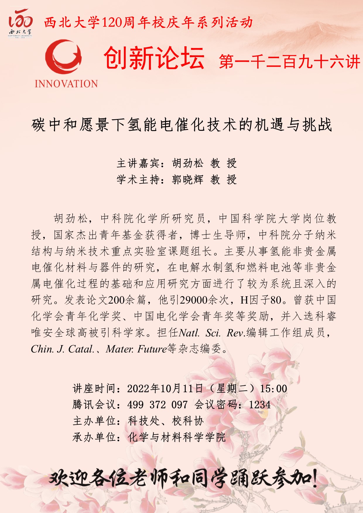 胡劲松 教授 广发体育创新论坛第一千二百九十六讲暨120周年校庆年系列活动: 碳中和愿景下氢能电催化技术的机遇与挑战 讲座时间 2022年10月11日(星期二)15:00 讲座地点 腾讯会议 499 372 097 会议密码 1234 讲座人介绍 胡劲松 教授 讲座内容