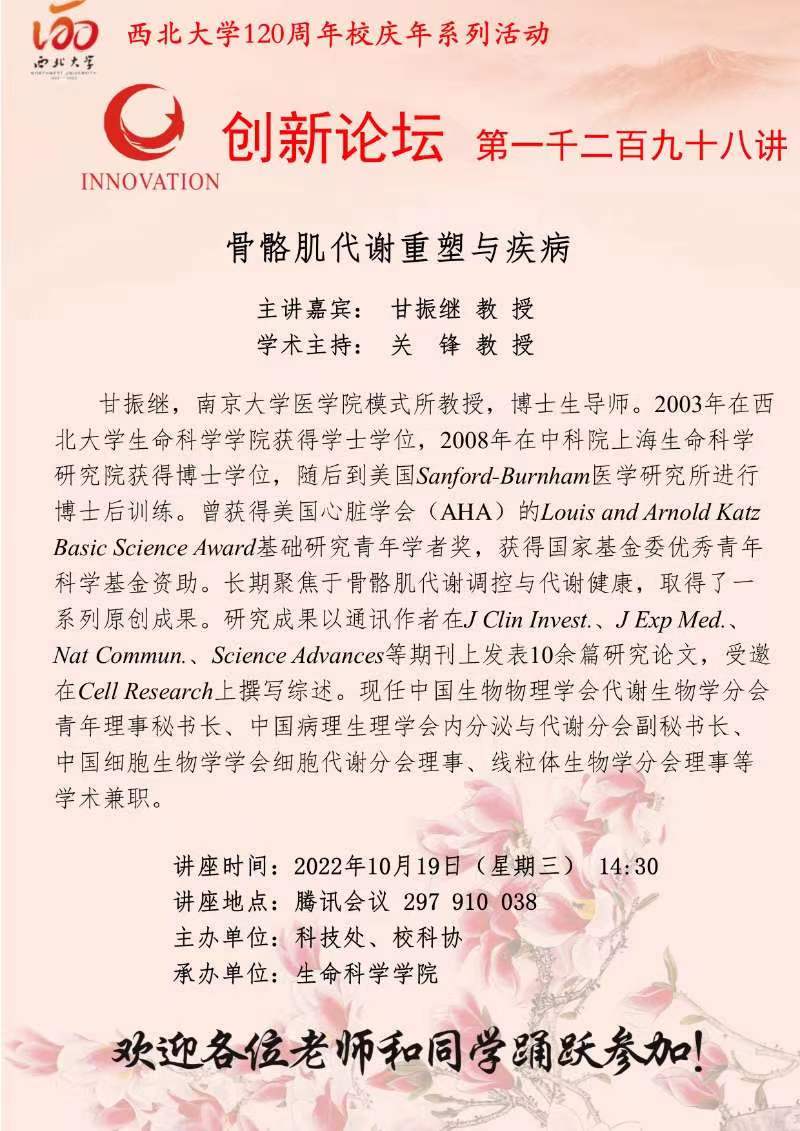 甘振继 教授 广发体育创新论坛第一千二百九十八讲暨120周年校庆年系列活动: 骨骼肌代谢重塑与疾病 讲座时间 2022年10月19日(星期三) 14:30 讲座地点 腾讯会议 297 910 038 讲座人介绍 甘振继 教授 讲座内容