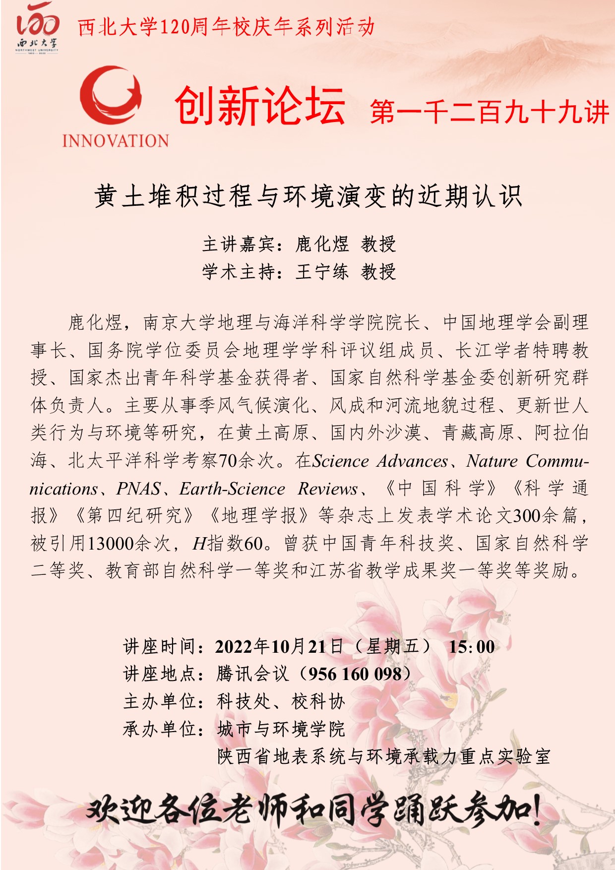 鹿化煜 教授 广发体育创新论坛第一千二百九十九讲暨120周年校庆年系列活动:黄土堆积过程与环境演变的近期认识 讲座时间 2022年10月21日(星期五) 15:00 讲座地点 腾讯会议(956 160 098) 讲座人介绍 鹿化煜 教授 讲座内容