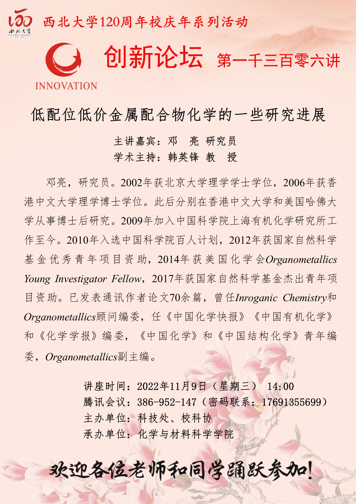 邓亮 研究员 广发体育创新论坛第一千三百零六讲暨120周年校庆年系列活动: 低配位低价金属配合物化学的一些研究进展 讲座时间 2022年11月9日(星期三) 14:00 讲座地点 腾讯会议 386-952-147 讲座人介绍 邓亮 研究员 讲座内容