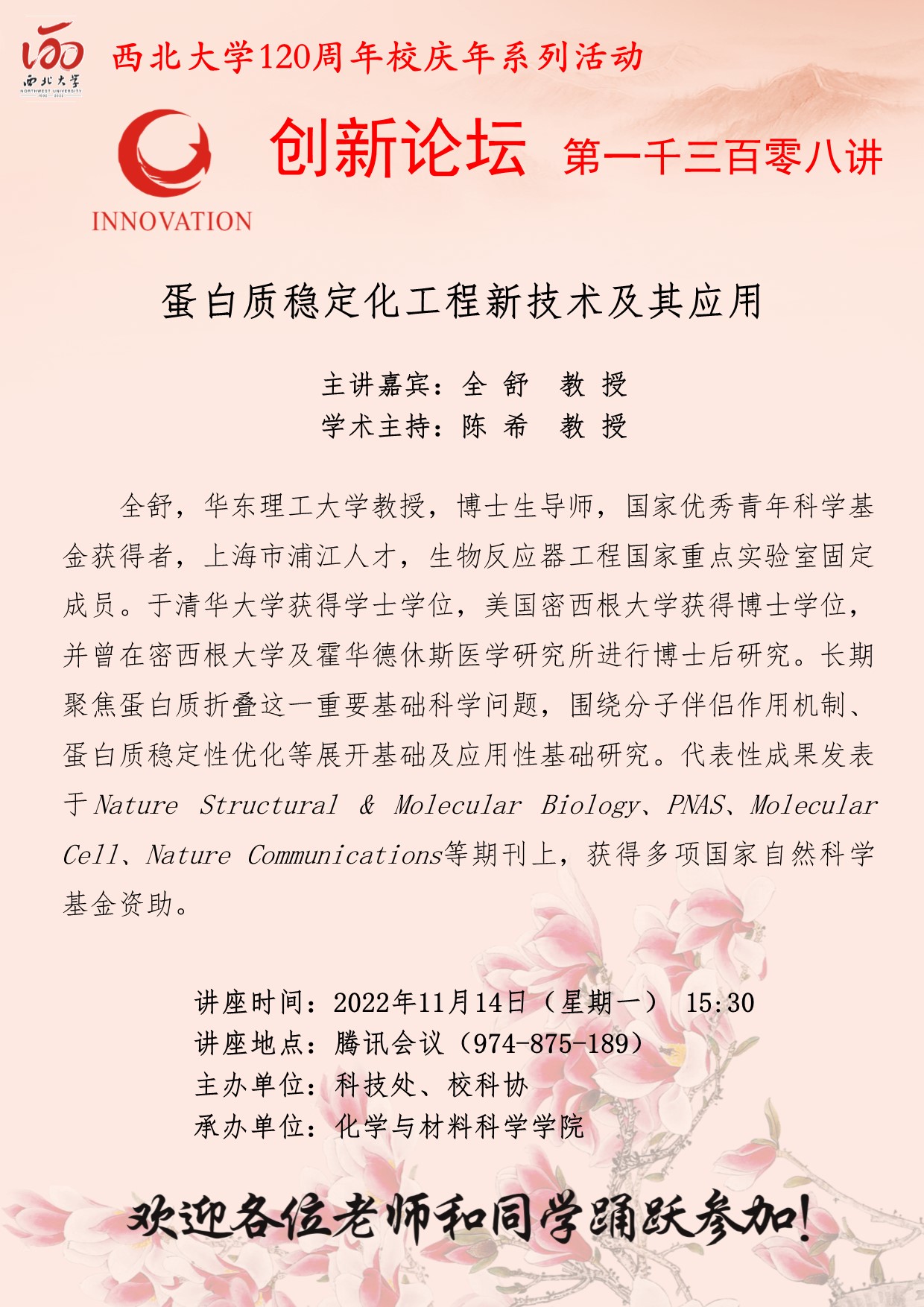 全舒 教授 广发体育创新论坛第一千三百零八讲暨120周年校庆年系列活动: 蛋白质稳定化工程新技术及其应用 讲座时间 2022年11月14日(星期一)15:30 讲座地点 腾讯会议(974 875 189) 讲座人介绍 全舒 教授 讲座内容