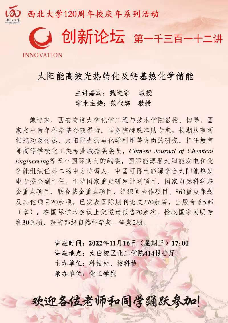 魏进家 教授 广发体育创新论坛第一千三百一十二讲暨120周年校庆年系列活动:太阳能高效光热转化及钙基热化学储能 讲座时间 2022年11月16日(星期三)17:00 讲座地点 太白校区化工学院414报告厅 讲座人介绍 魏进家 教授 讲座内容